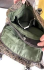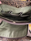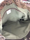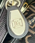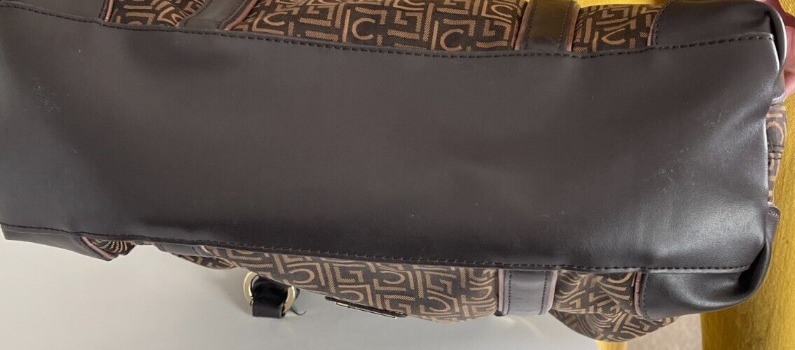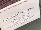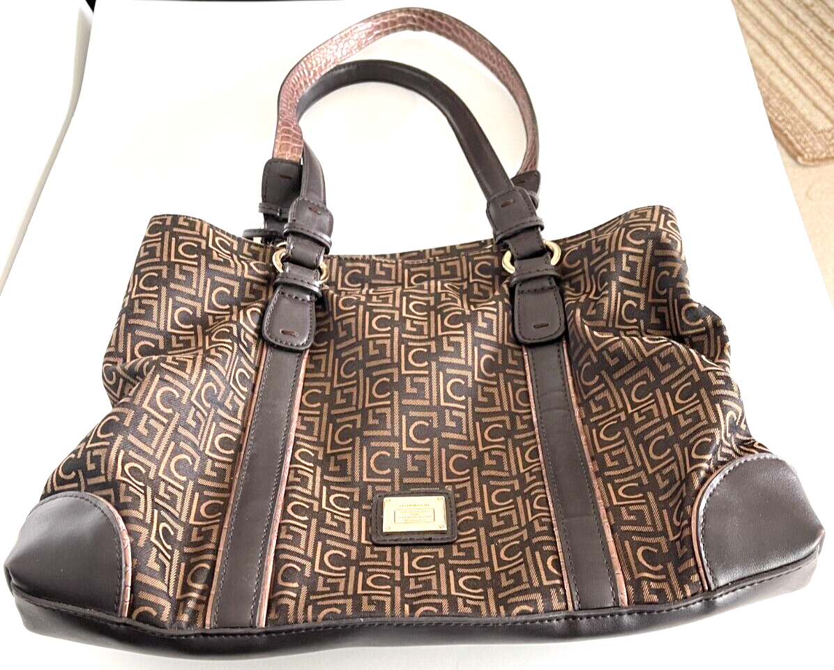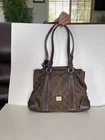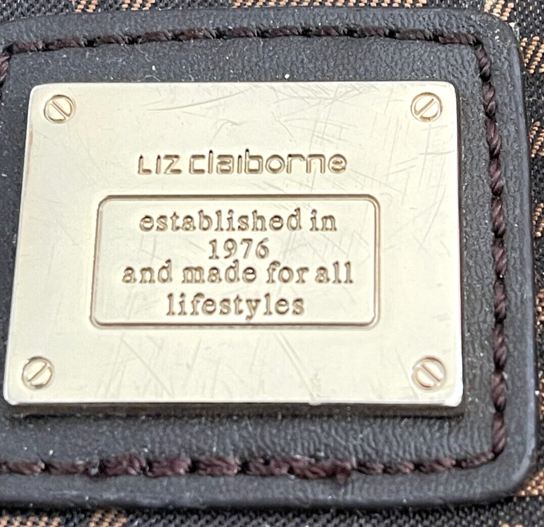 This Liz Claiborne tote is a stylish accessory for any occasion. The bag features a brown exterior with a logo print, leather trim, and gold-plated hardware. It has a zipper and snap closure with double handles and measures 13 inches in width, 9 inches in height, and 4 inches in depth. The tote is lined with brown fabric and includes inner pockets, dividers, and is waterproof and water-resistant. The bag is perfect for travel, casual outings, formal events, and business meetings. This designer bag is a great addition to any collection and is sure to impress. Bin: M 26