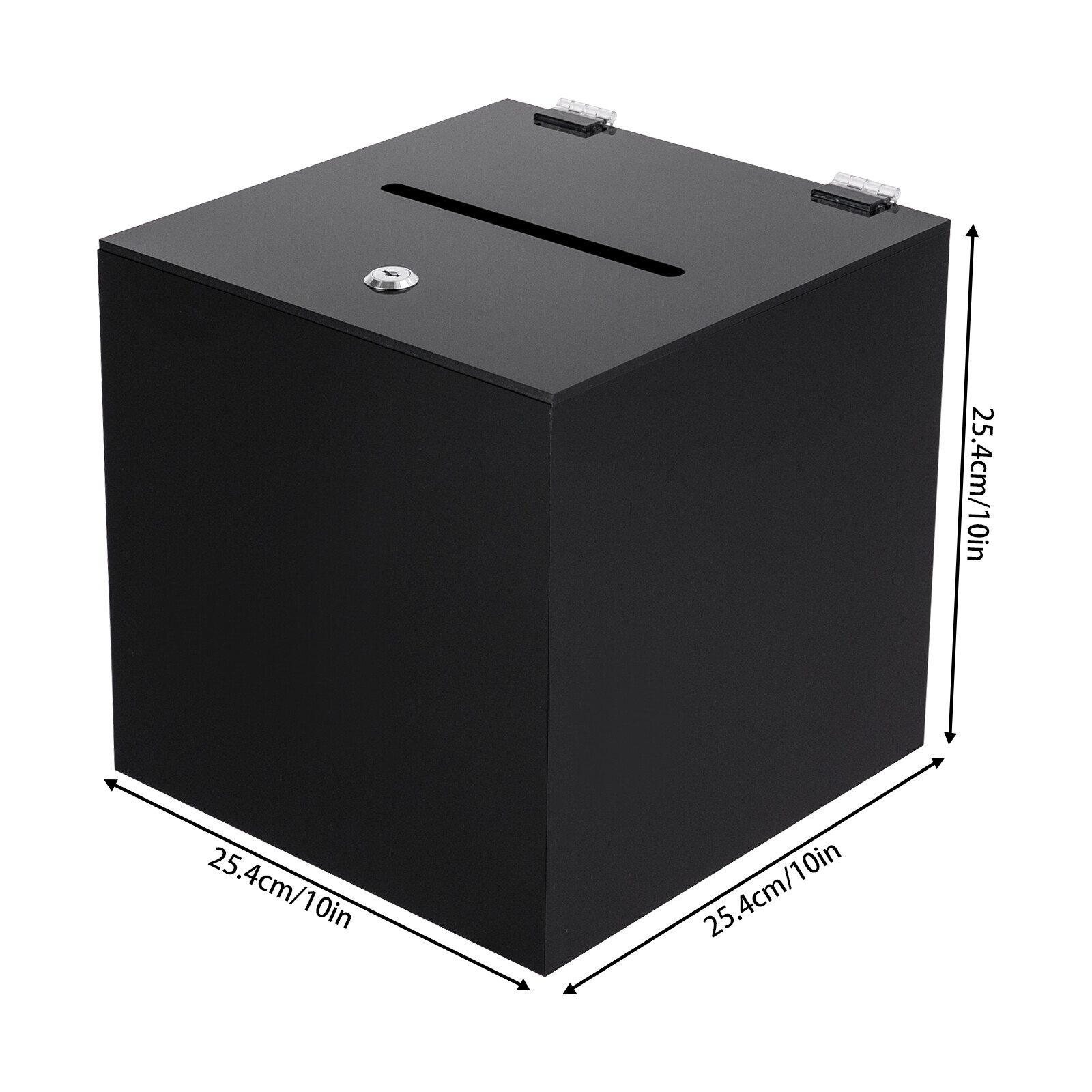 Package Included 1* Acrylic Donation Box 2* Keys Key Features Sturdy and Durable: It is made of acrylic and adopts a laser cutting process, which has high toughness and wear resistance. It is not easy to break and deform, so you can use it for a long time. Versatile Appearance: It adopts a classic black color design that can match most decorating styles and color themes, which is suitable for most use scenarios. Safe to Use: This product is equipped with a security lock, which not only protects privacy but also ensures the safety of the items in it. Easy to Clean: The simple construction and smooth surface makes it easy to clean and you just need to wipe it with a damp cloth (not included). Ready to Use: You can use this product directly after receiving it without add Acrylic Donation Box, Suggestion Box with Lock, Money Storage Container Black Welcom to yybshop06 Description This donation box combines function and fashion. Not only does it have a stylish design, but also it has a great deal of versatility and can be used for events such as voting, fundraising, elections, and so on. This acrylic donation box is sturdy and durable and comes with a lock and two keys to ensure security. Come and buy it. Key Features Sturdy and Durable: It is made of acrylic and adopts a laser cutting process, which has high toughness and wear resistance . It is not easy to break and deform, so you can use it for a long time. Versatile Appearance: It adopts a classic black color design that can match most decorating styles and color themes, which is suitable for most use scenarios. Safe to Use: This product is equipped with a security lock, which not only protects privacy but also ensures the safety of the items in it. Easy to Clean: The simple construction and smooth surface makes it easy to clean and you just need to wipe it with a damp cloth (not included). Ready to Use: You can use this product directly after receiving it without additional installation, which saves you time and energy. Large Capacity: With a strong load-bearing capacity (4.41 lbs) and a large interior size ( 9.88*9.88*9.88 inches ) , you can feel free to put letters, cards, money, and so on into it. Compact & Portable: Its lightweight (5.51 lbs) and compact size (10*10*10in) allow it to be placed on the tabletop without taking up too much space and can be carried and stored with less effort. Thoughtful Design: The top slot with a suitable size (0.31*4.72in) is convenient for you to put in letters or cards. Protective Packaging: To prevent the product from being damaged during transportation, we packed it with bubble bags to protect your products to the maximum extent possible. Details Fully Openable Lid: The top lid can be opened fully to take out the items from the box easily. 2 Keys: The two keys make it easy for you to use one of them as a spare in case you lose it. Application This product can be used for fundraising, voting, collecting suggestions, feedback, complaint letters, and so on, as well as for storing money, postcards, cards, and so on. It can be widely used at home, office, school, shopping mall, weddings, and other occasions or places. Specifications Color: Black Material: Acrylic Process: Laser Cutting Shape: Square Style: Modern Assembly Required: No Mounting Type: Free Standing, Tabletop Load Capacity: 2kg/4.41 lbs Number of Keys: 2 Thickness: 3mm/0.12in Product Inner Size: 25.1*25.1*25.1cm/9.88*9.88*9.88in Top Slot Size: 0.8*12cm/0.31*4.72in Product Size: 25.4*25.4*25.4cm/10*10*10in Package Size: 30*30*30cm/11.81*11.81*11.81in Gross Weight: 3kg/6.61lbs Net Weight: 2.5kg/5.51lbs Package Included 1* Acrylic Donation Box 2* Keys Notes Please confirm the dimensions before purchasing. Please note this product does not include any cards, letters, or money. Please allow the slight color difference caused by the shooting light and 1-3 cm error due to manual measurement, and make sure you do not mind before ordering. Payment Delivery details Terms of sales About us Contact us Payment We accept ebay payment 。 Fees such as import duties, taxes are not included in the item price or shipping costs. These charges are the buyer's responsibility. Delivery details Shipping: 2-9 working days to: USA Terms of sales We maintain high standards of excellence and strive for hundred percent customer satisfaction. Feedback is very important to us. We hope that you contact us immediately before you give neutral or negative feedback, so that we can address your concerns. It is impossible to address issues if we do not know about them! About us Your satis faction is our ultimate goal. We work hard to earn your trust and future business. Our certified technicians have tested each item before shipping. The unit comes with 1 year limited warranty on all manufacturing defects. a) If you receive a defective item, you may return it or ask for a discount. Please contact us within 14 days after you receive the package. b) What you returned must be intact and in its original packaging as re? u. Customer is responsible for shipping costs of the returned item. c) We will cover the cost of shipping back t with the shipping rate indicated in the registration page. We will send you a new unit or refund the full payment you paid. Thank you. Contact us Business Hour Business Hour: Monday To Friday: 8:30 AM to 5:00 PM (Beijing China time) Due to time zones, our reply to your questions may not be immediately. But within above working time, we will reply your email within 24 hours. If it's non-workdays, please kindly be patient and wait till Monday. Please contact us with ebay message. Please feel free to contact us if you have any questions. Monday To Friday: 8:30 AM to 5:00 PM (Beijing China time) Due to time zones, our reply to your questions may not be immediately. But within above working time, we will reply your email within 24 hours. If it's non-workdays, please kindly be patient and wait till Monday. Please contact us with ebay message. Please feel free