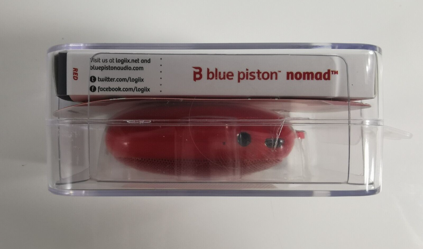 LOGIIX LGX-11981, Blue Piston Nomad Bluetooth Speaker and Shutter Remote, Red With the Blue Piston Nomad by LOGiiX, be prepared to experience big sound in a small size for a great price. Pair the Nomad to your device via Bluetooth and enjoy your music anywhere you go with this ultra compact custom HD sound speaker. With Nomad's rechargeable Li-ion polymer battery, you can listen to music for 4 hours straight. For added convenience, the Nomad has a built-in Micro SD/TF Card reader so you can load your favorite tunes directly to the speaker. Say no to side effects of bad selfie photos and videos, like awkward hand and arm placement, blurriness or distortion because the Blue Piston Nomad has a camera shutter control. It connects to both iOS and Android devices via Bluetooth and does not require any Apps. Bluetooth Version 3.0 EDR 3W driver with play time up to 4hr Camera remote for iOS and Android devices Micro SD/TF card reader (card not included) Hands-free, talk time up to 8hr Please not this product is New and still sealed from 2016. Battery may need replacing.