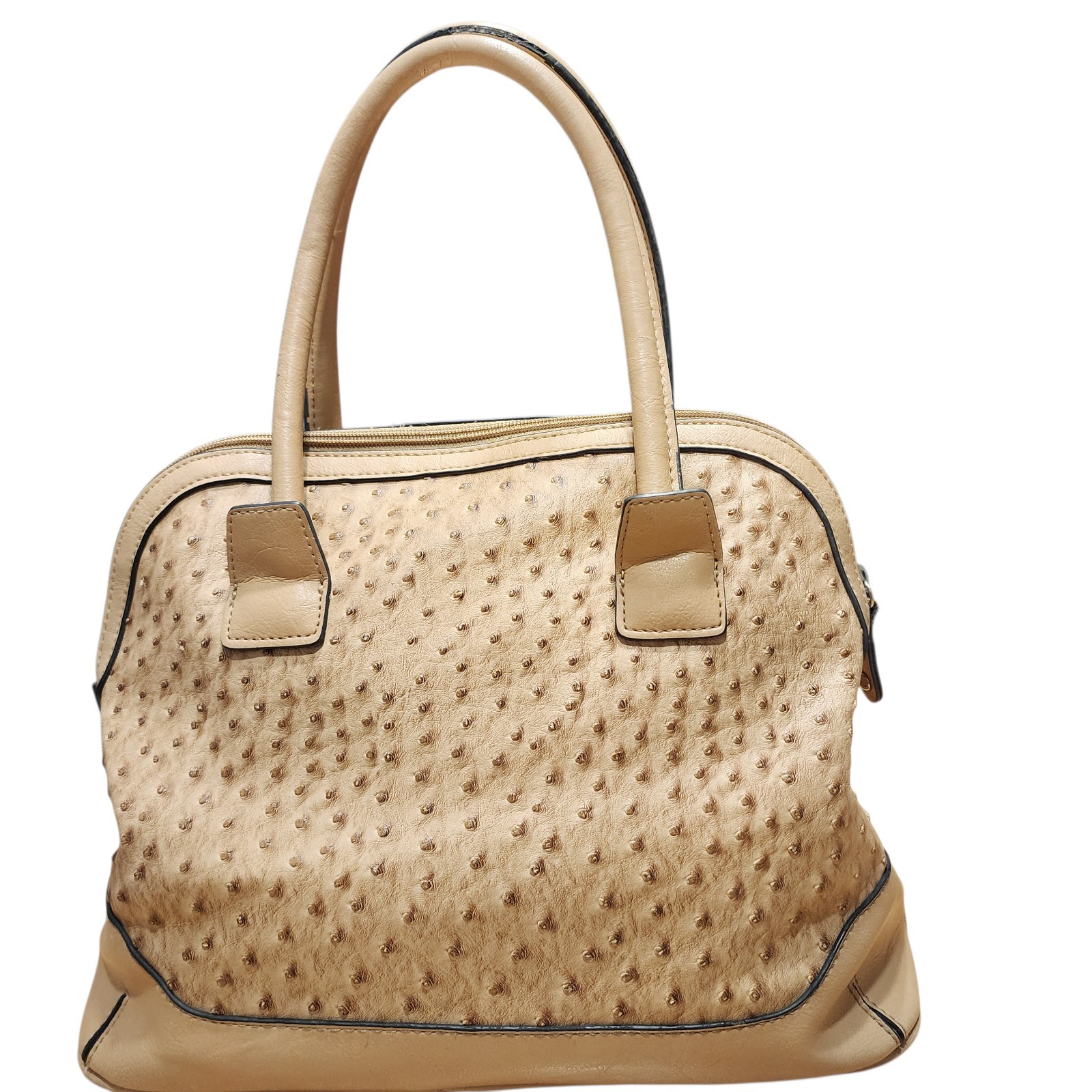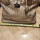 The London Fog Amber Ostrich Embossed Vegan Leather Satchel Bag in beige is a stylish and versatile handbag designed for women. Made from faux ostrich material with silver hardware, this medium-sized satchel features a zip closure and a beige handle/strap for easy carrying. The classic design and London Fog branding make it a timeless accessory for any outfit, while the hidden lock adds a touch of security. Perfect for everyday use or special occasions, this handbag combines fashion and functionality in a chic package. The exterior of the bag is in a very good condition but the lining has pen marks and sings of wear.