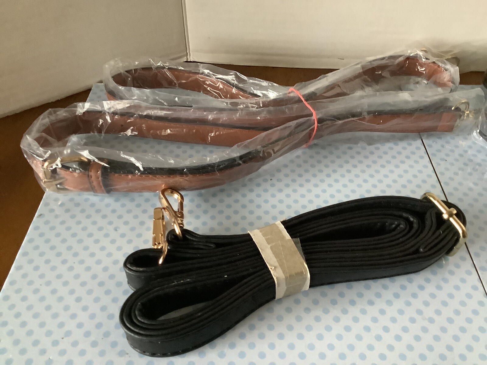 Pre-owned not used. These are four handles for purses three are the color black and one is a tan color. Two of them I know are about 47 inches long \ I don’t know if they’re real leather or not The other two I did not unfold, but they have been kept in the plastic cover. Please view photos.