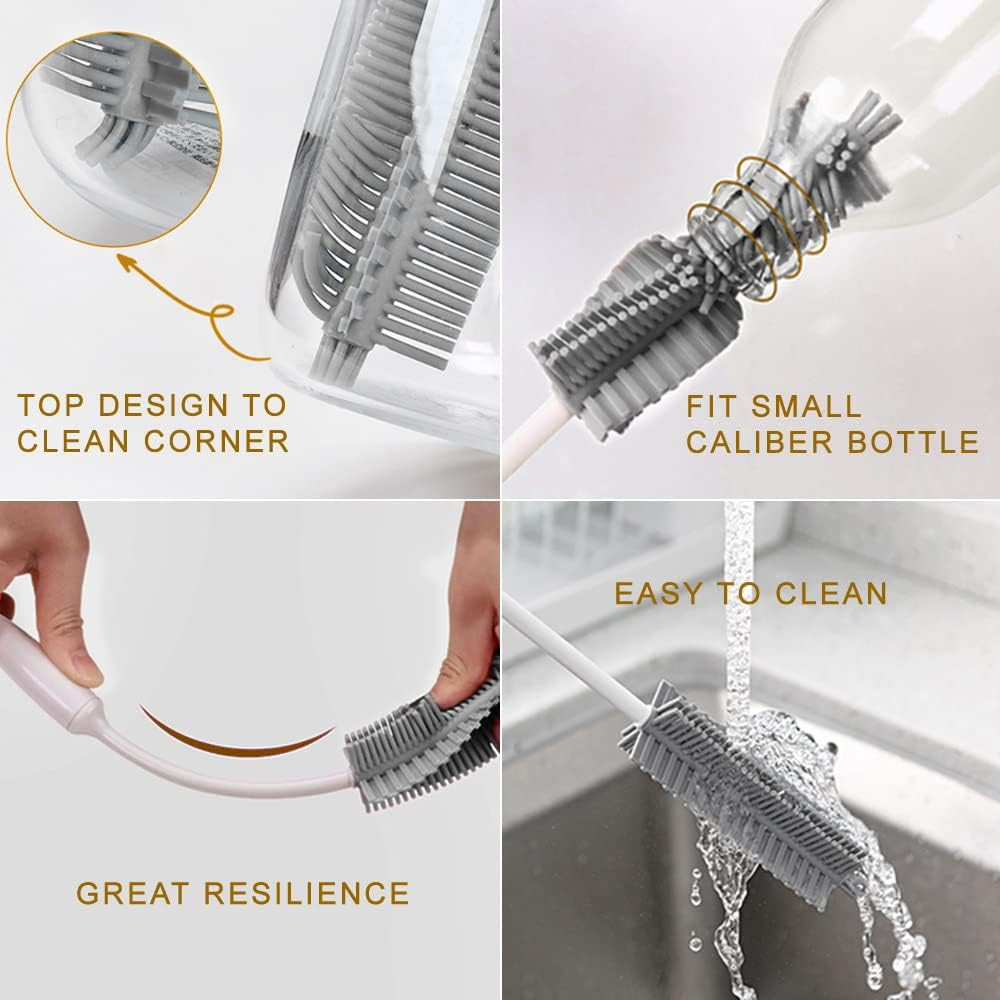 Bottle Cleaning Brush Set, Long Handle Silicone Cleaner Brushes + Gray, White Product Details Brand: leuapl Color: Gray, White Handle Material: Polypropylene Specific Uses For Product: Bottle, Water Bottle, Straw, Thermos Lid, Cup Product Dimensions: 12.59"L x 3.14"W x 1.37"H Long handle silicone brush:This cleaning brush has BPA free food grade flexible silicone bristles. Brush are tough on gunk, yet gentle enough to leave your bottle clean and scratch-free. Not a cheap thin or wire handle like other products. Firm and sturdy handle is easy to hold and use, the hook provided to hang it for drying and storage. 3-in-1 Bottle Lid cleaning Brush:This cleaning brush has 3 tool heads: ① Grey beveled brush can remove stubborn stains on the bottle lid. ② Stainless steel spiral brush can remove the stains in the creases and gaps inside the bottle lid.③ Gasket remover can help us easily remove the silicone gasket or rubber lid. Thicker and longer drinking straw cleaning brush: Length : 7.9 inches ( 20cm ); Bristle Diameters: 0.4inches; Made of Food Grade 304 Stainless Steel Wire and durable Long Nylon Bristles For Cleaning. Thoroughly Clean:Top design of the silicone brush makes it very easy to get the sides and corners.Durable bendable to reach even the most difficult of inside crevices. Adding additional bristles at the very end of the brush to get a thorough cleaning of the bottles bottom. There can repels unpleasant odors, stains, preventing nasty stains build-up which is more healthier for your family. You will no longer worry about the smelly sponge bristles, it may replace all bottle brush in your home . Multipurpose Cleaning Tools:This bottle cleaning brush set is designed to reach down into every corner of the bottles to properly clean them by cleaning residue. They can be applied to your dishes, baby bottles, Kids Food Jar, sports water bottles, stemware, vases, drinking glasses, glass mugs, tea pots, narrow neck carboys, stainless steel tumbler thermos ,wine decanter etc.