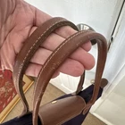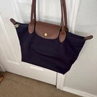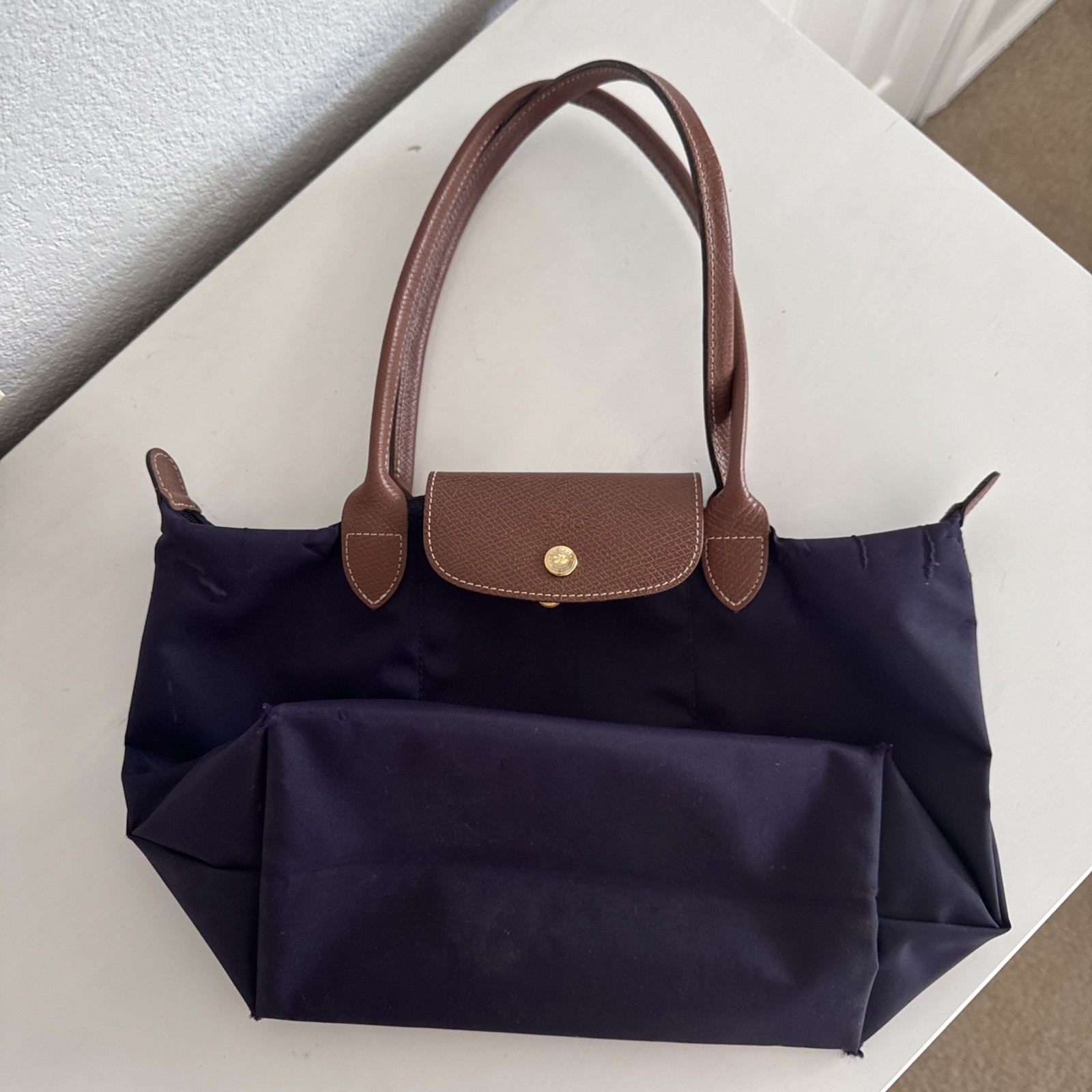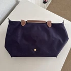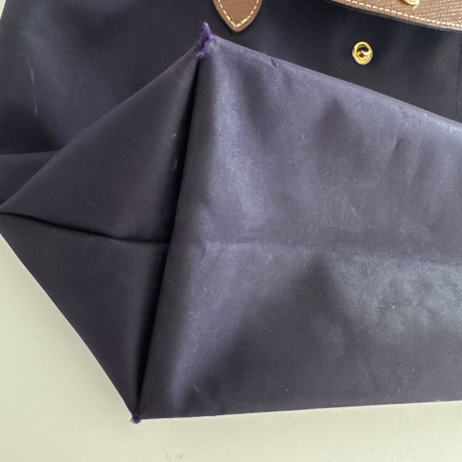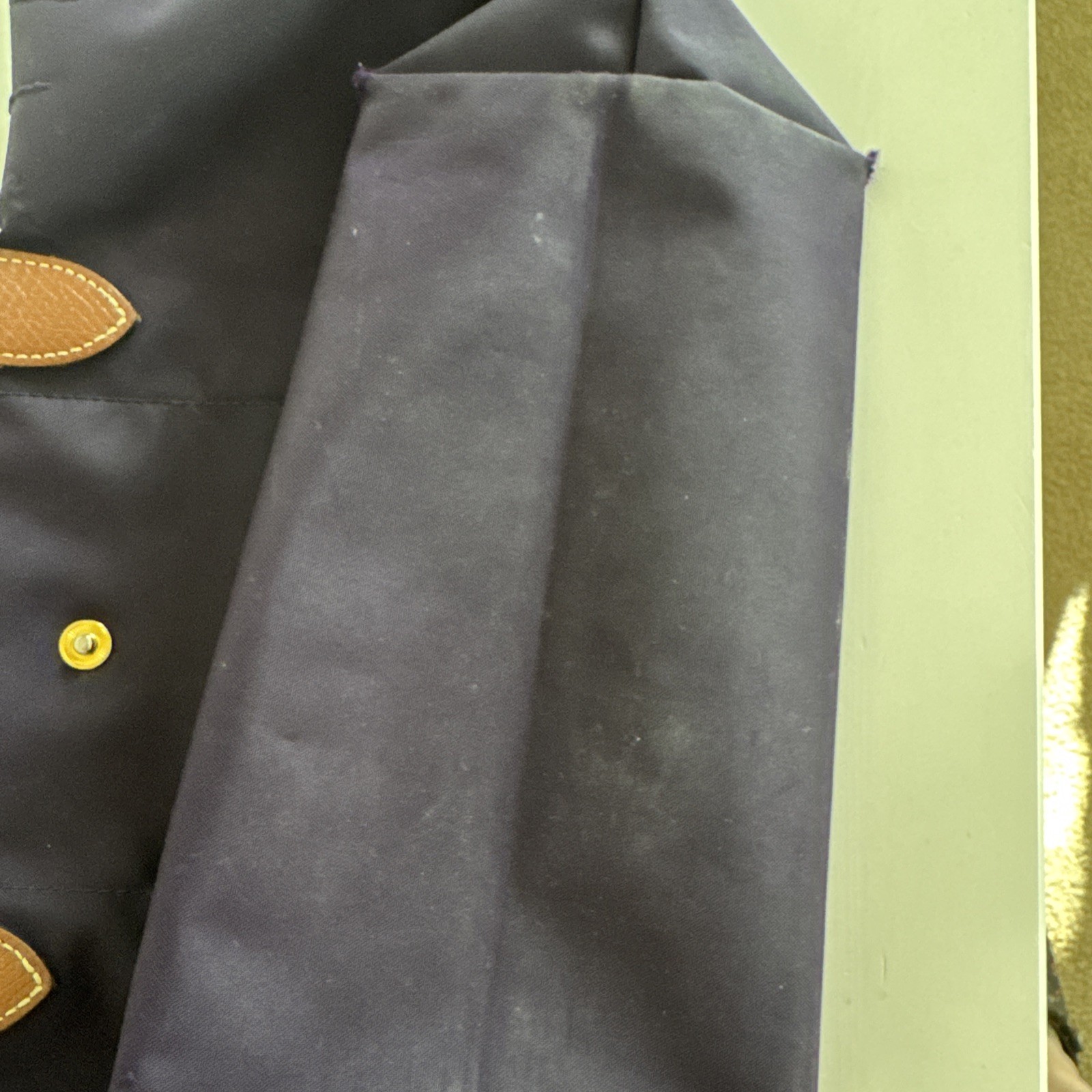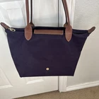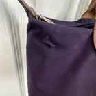 The Longchamp Le Pliage Medium Original Shopping Tote Bag in Purple Nylon Leather is a stylish and practical handbag for women. With a rectangular shape and a medium size, this tote features a zip closure, gold hardware accents, and double handles in brown nylon and leather. The bag is made of durable nylon exterior material with a black nylon lining, making it a stylish and functional choice for everyday use. The Longchamp Le Pliage product line is known for its folding design, making it convenient for storage and travel. Wear to all 4 corners, pictured. Light wear to the strap, pictured. All wear is pictured.