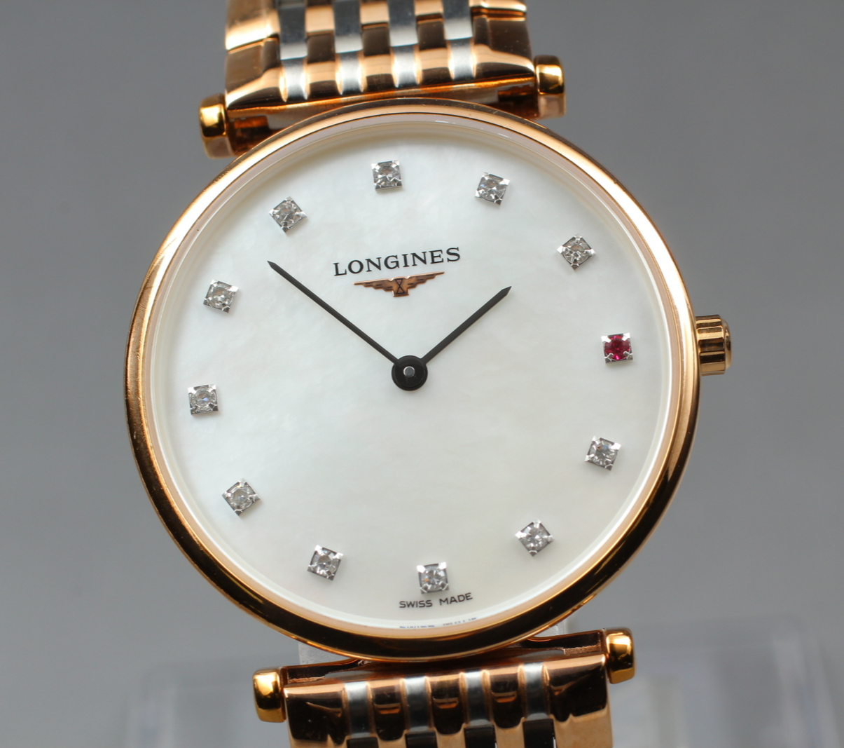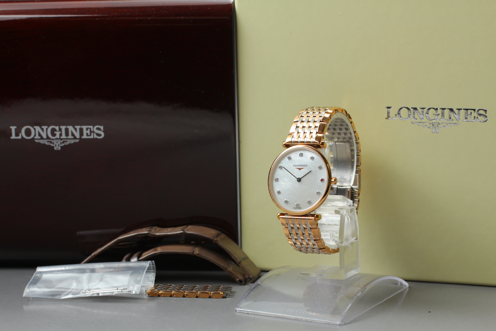 Watch Shape: Round Max Wrist Size: 7.28 inches Brand: Longines Reference Number: 53687081 Country/Region of Manufacture: Switzerland Bezel Color: Rose gold Type: Wristwatch Case Color: Rose gold Display: Analog With Original Box/Packaging: Yes Customized: No Band Material: Stainless Steel Features: 12-Hour Dial With Papers: Yes Indices: Diamond Markers Movement: Quartz Band/Strap: Bracelet Bundle Description: ・Unused original stainless steel bracelet + 6 extra links ・O Style: Luxury Band Color: Silver, rose gold Custom Bundle: Yes Case Size: 28 mm Model: La Grande Classique Department: Unisex Adults Dial Color: Shell Case Material: Stainless Steel