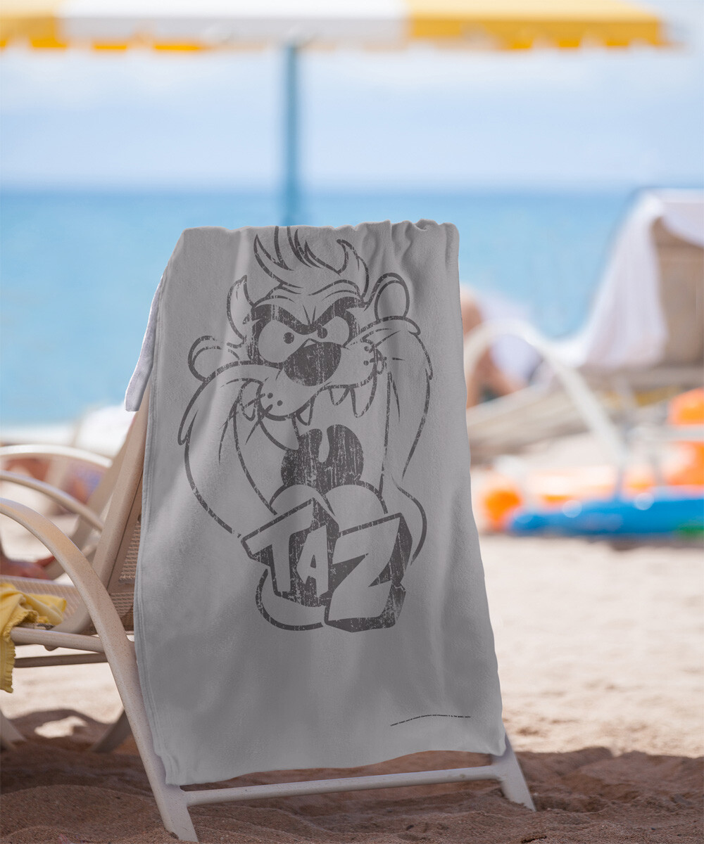 Personalize: No Size: 30 in x 60 in Item Length: 60 Features: Quick-drying Department: Adult, Teens, Kids Care Instructions: Machine Wash Type: Beach Towel Material: Polyester Front/Cotton Back Room: Any Room Set Includes: Beach Towel Activity: Beach Country/Region of Manufacture: United States Shape: Rectangle Character Family: Looney Tunes gtin13: Does not apply Pattern: Faded Taz Color: Multicolor UPC: Does not apply Brand: Looney Tunes Item Thickness: 300 GSM Item Width: 30 Softness: Soft Theme: Cartoons & Characters