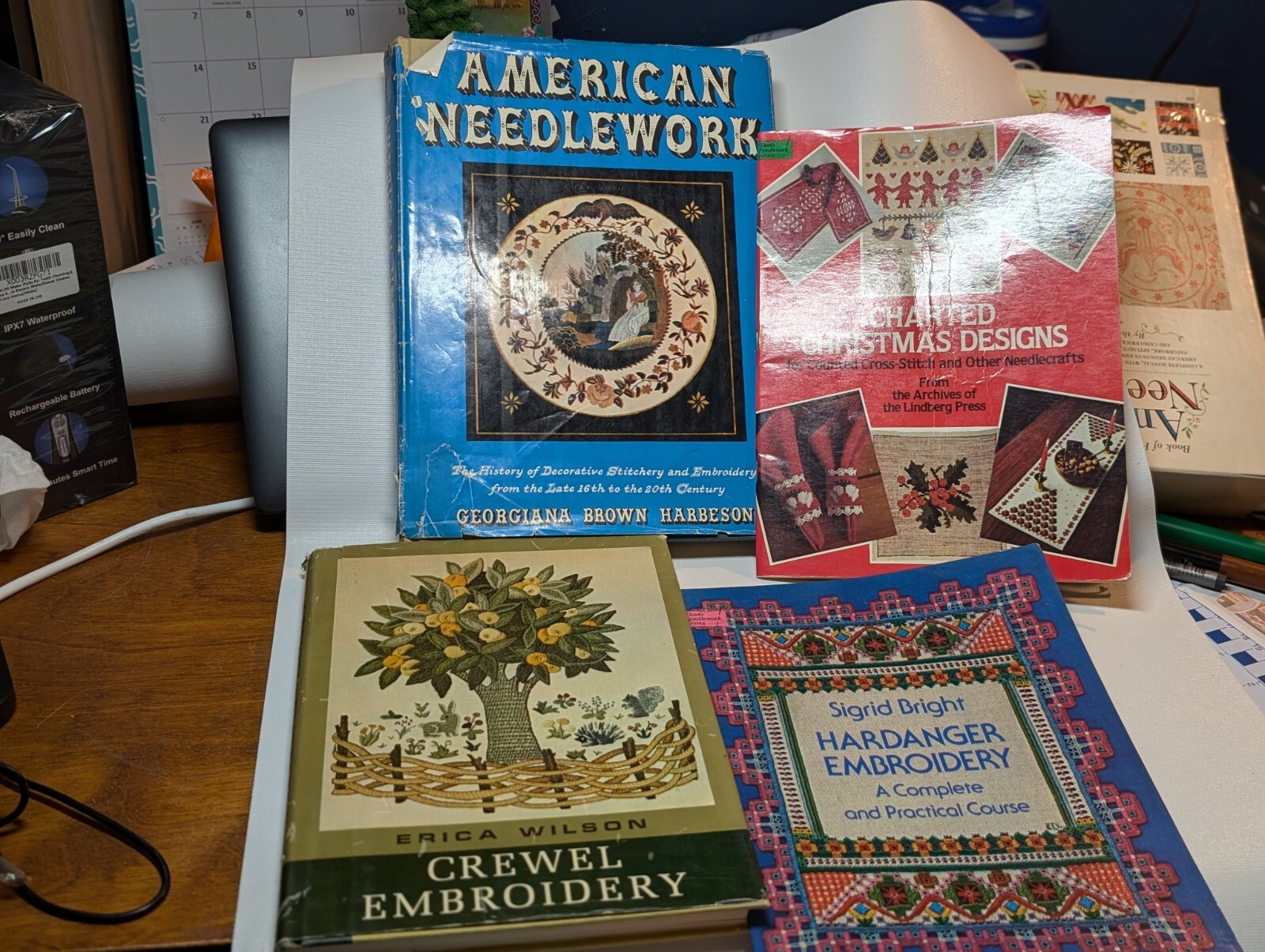 1-American Needlework 2-Crewel Embroidery 3-Charted Christmas Needlecraft Designs: cross stitch, dover designs 4- Hardanger Embroidery; complete course