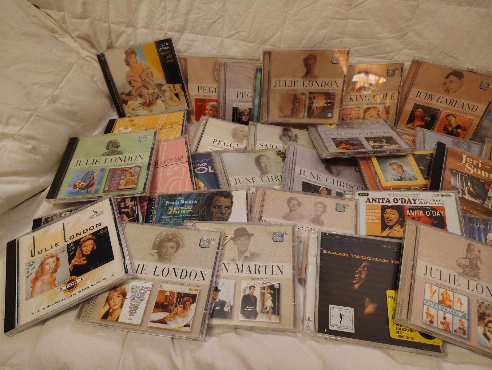 This is a lot of 46 CDs of the finest jazz and big band vocalists of the 40s, 50s and 60s. There are lots and lots of 2 LPs on 1 CD. Included are: 1) 5 Jeri Southern 2) 2 Keely Smith 3) 2 Judy Garland 4) 1 Jo Stafford 5) 1 Sue Raney 6) 2 Doris Day 7) 2 Margaret Whiting 8) 1 Helen Forrest and Trudy Richards 9) 1 June Button and Delores Gray 10) 1 Anita O'Day 11) 2 Linda Ronstadt 12) 2 Frank Sinatra 13) 1 Nat King Cole 14) 1 Dean Martin 15) 2 Ella Fitzgerald 16) 10 Julie London 17) 5 Peggy Lee 18) 2 Sarah Vaughan 19) 3 June Christy. These all play excellent. Some of the jewel cases are cracked or scuffed, but those can be easily replaced. This is a nice collection of all the finest jazz vocalists from yesteryear. These are sold as is. Please don't hesitate to ask any and all questions. Please see all pics for titles.
