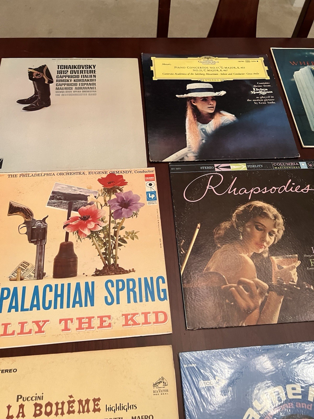 This lot of 17 vintage vinyl records features various artists such as Eugene Ormandy, Artur Rubinstein, and The Vienna State Opera Orchestra. The records are in 33 RPM LP format and come in a cardboard sleeve case. With a mix of classical music by composers like Mozart and Bacharach, this collection is perfect for vinyl enthusiasts and collectors of orchestral music.