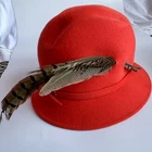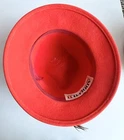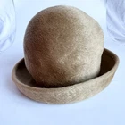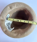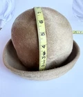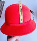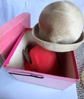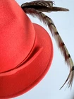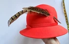 Two lovely ladies hats. Suitable for all occasions to tastefully express your individual style: The orangey-red Adolfo II is felted wool and has 3 arched pheasant feathers accent at one side. The clean, interior measurement of this hat is 21” (see additional photos). There is some very light soiling on the red hat which is difficult to see (see our photos for this mention). The brushed mohair camel hat is made by Mr. John of New York/Paris for Halle Brothers, inc. The interior band measurement of this rounded crown, turned-up brim, derby-ish hat is 19”. The hats have been kept in this Schapparelli pink and black hat box from Lazarus Department Store which we are including with this offering. The hats have been in climate storage and are originally from a smoke free home.