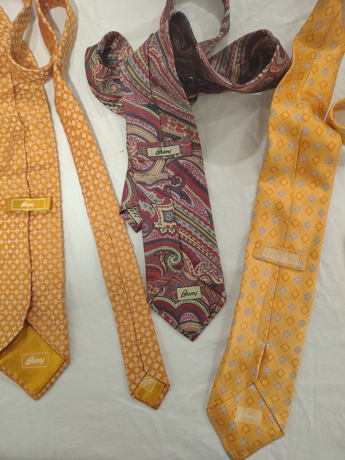 The product is a lot of three Brioni ties for men. These ties are multicolored and are stylish accessories that can add a touch of sophistication to any outfit. Made by the prestigious brand Brioni, these ties are sure to elevate the style of any formal ensemble.