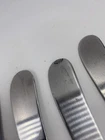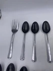 This is a mixed lot of 22 total pieces of vintage Japan Northland stainless pieces. It includes 6 table knives, 8 tablespoons, 3 teaspoons, 1 Butter knife, 1 large serving fork and 3 large serving spoons. All of these pieces have scratches, scuffs, markings and or discoloration. The spoons have a black look to the insides as shown. All of these pieces need a good clean up to bring them back to original beauty. You get the actual items pictured so please look at all photos and ask any questions before purchase.