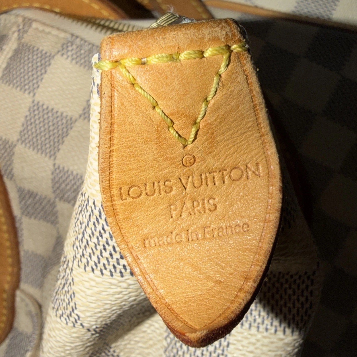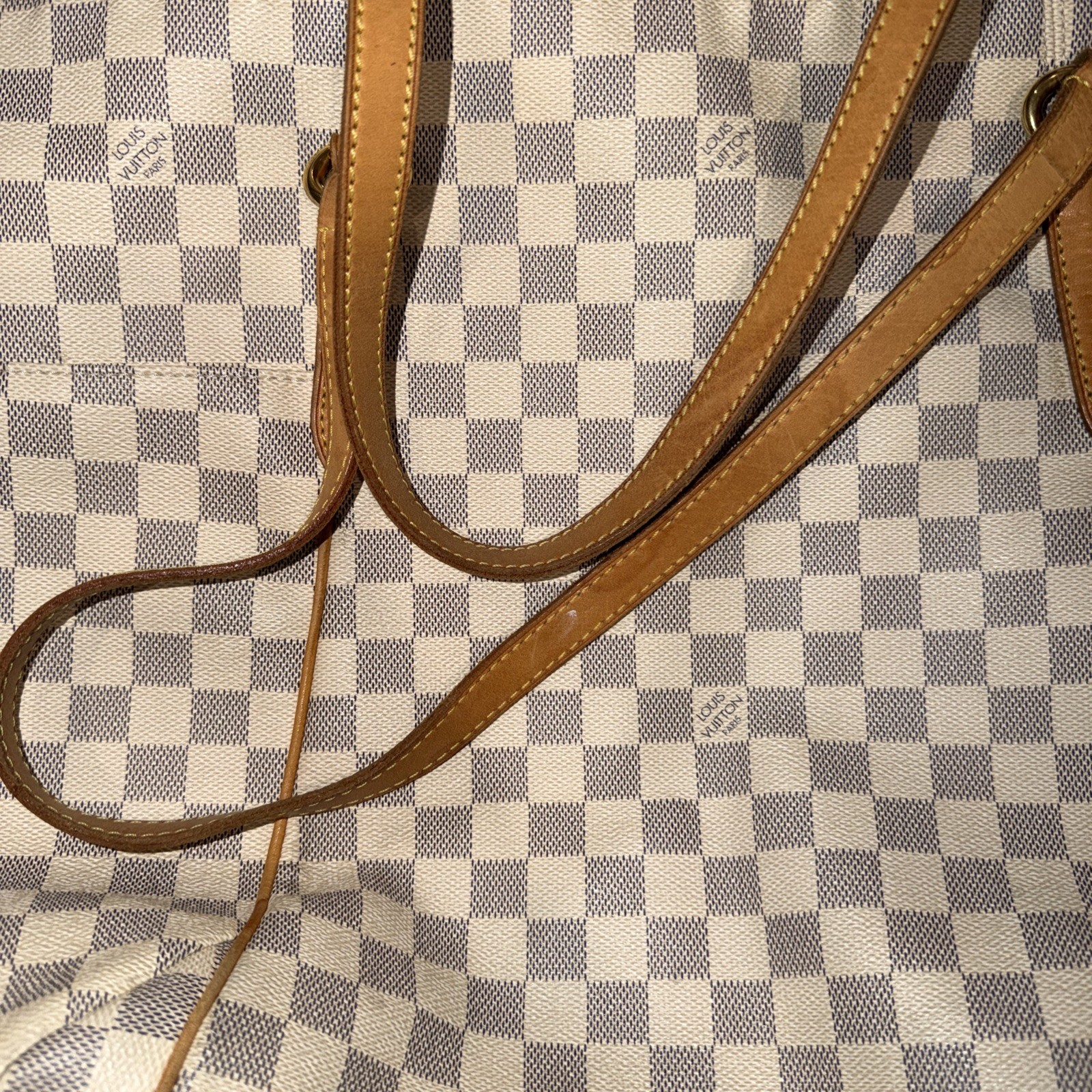 The Louis Vuitton Damier Azur Hand Bag is a stylish and elegant shoulder bag designed for women. Featuring a rectangular shape with a zip closure and gold hardware accents, this bag is made from white canvas with a coated finish. It includes inner pockets for added functionality and a leather handle/strap for comfort. This designer bag exudes luxury and sophistication, making it a perfect accessory for any outfit.
