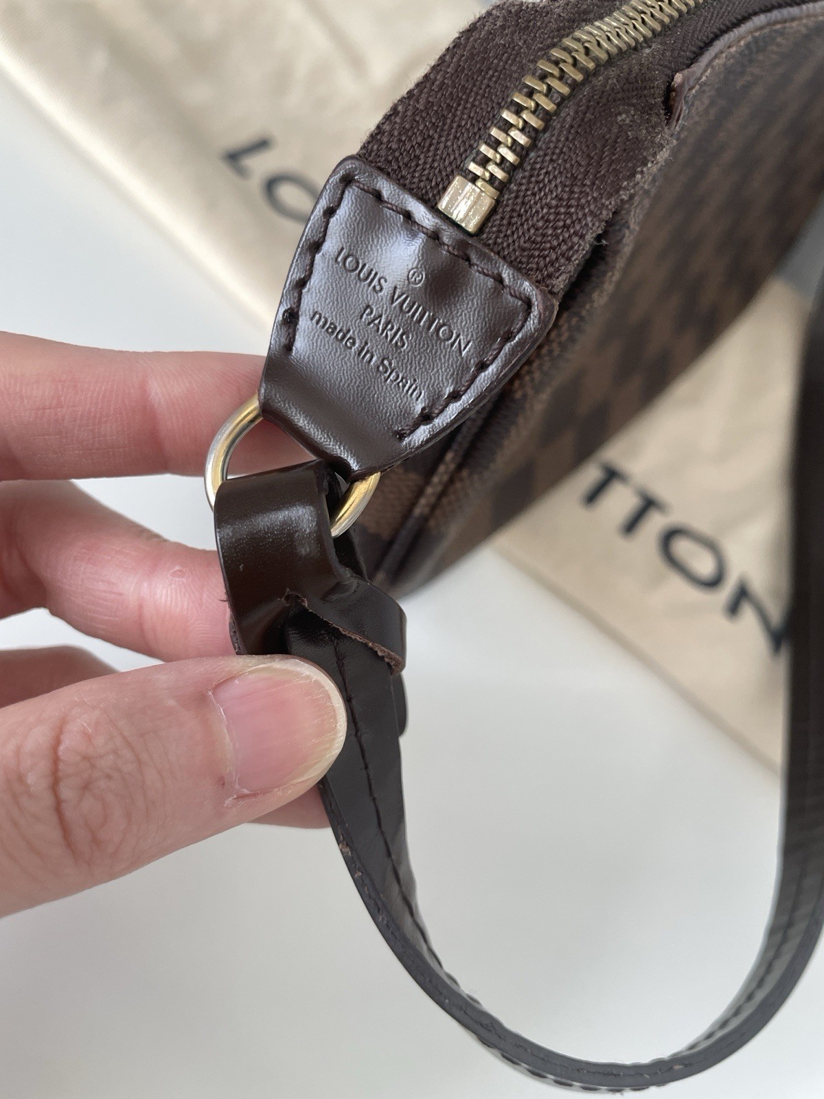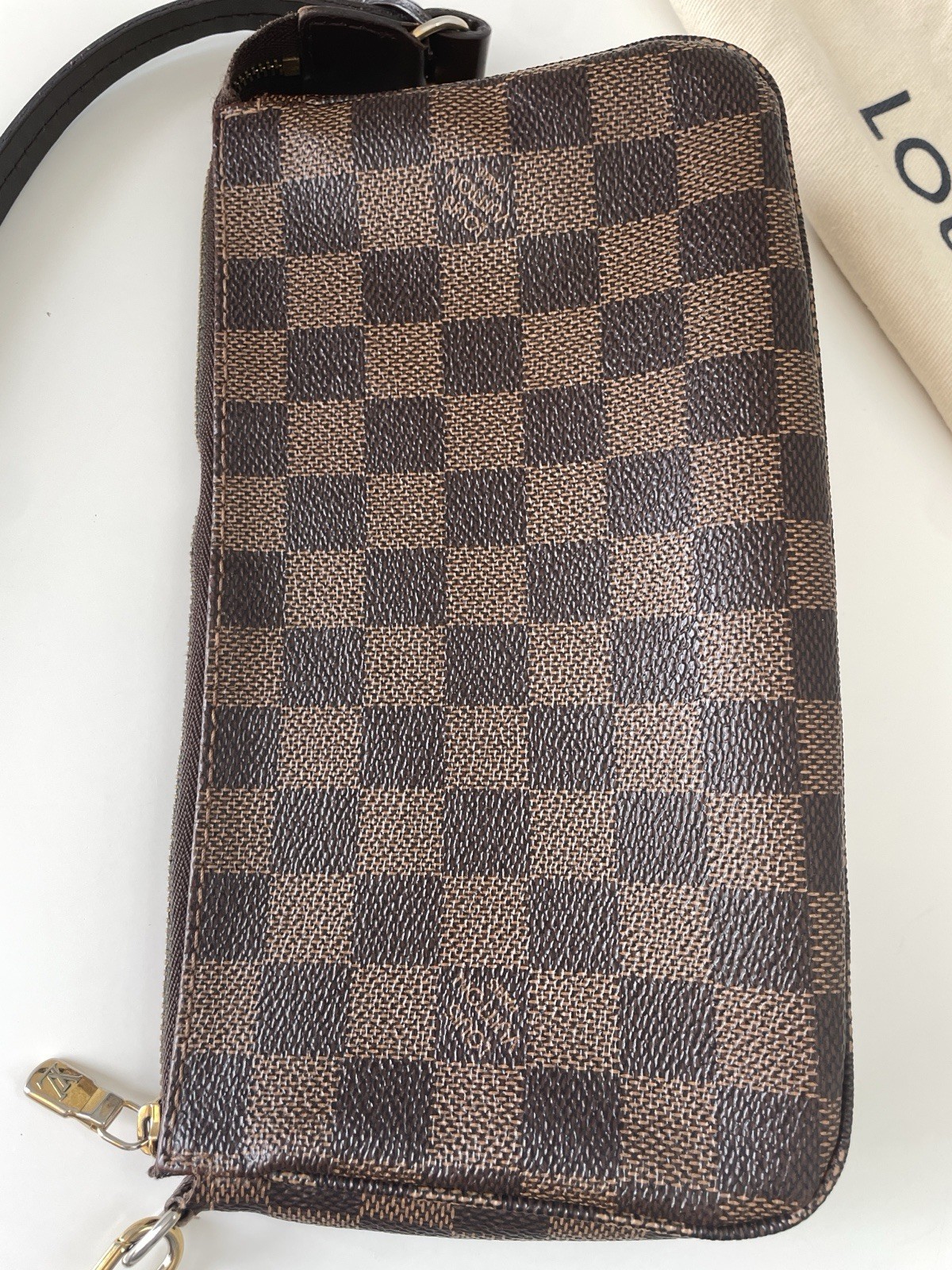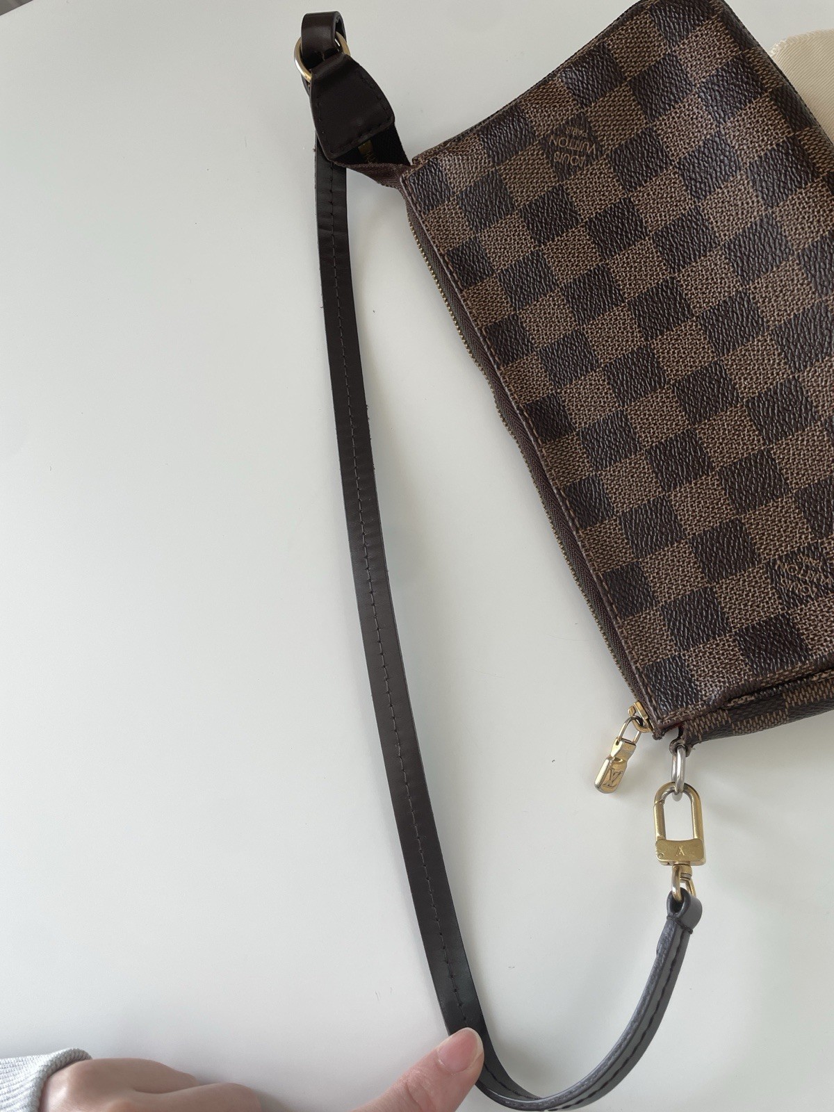 Authentic Louis Vuitton Pochette Accessories in the classic Damier Ebene canvas. This versatile piece can be used as a shoulder bag or clutch. Condition reflects photos. The canvas pattern is vibrant and the corners show no obvious heavy wear. Zipper runs smoothly and hardware is intact. Interior with normal signs of gentle use. Please review all photos carefully as they are part of the description and accurately represent the condition. Authentic guaranteed, sold as pictured, no returns accepted. Includes: • Louis Vuitton dust bag