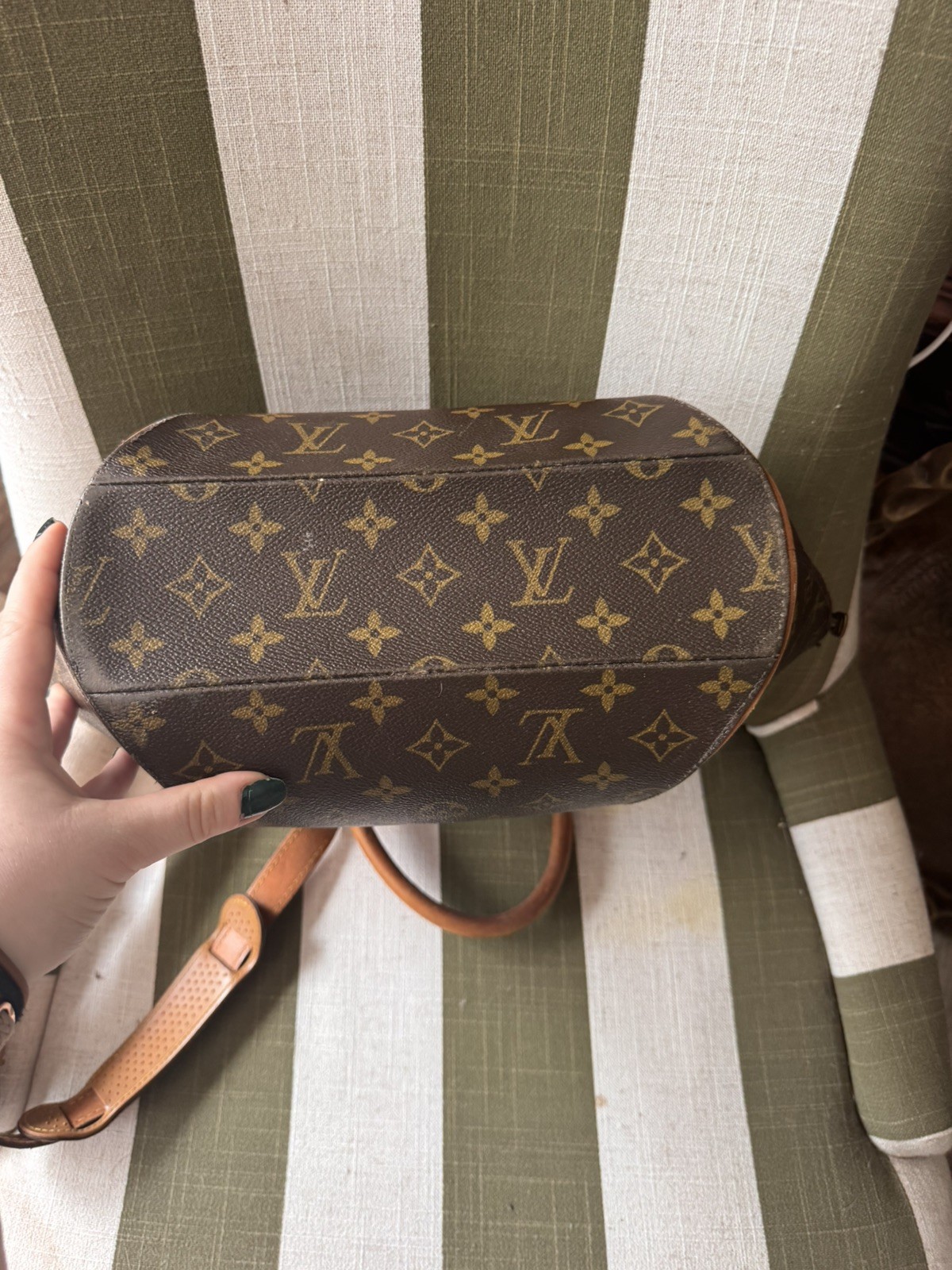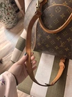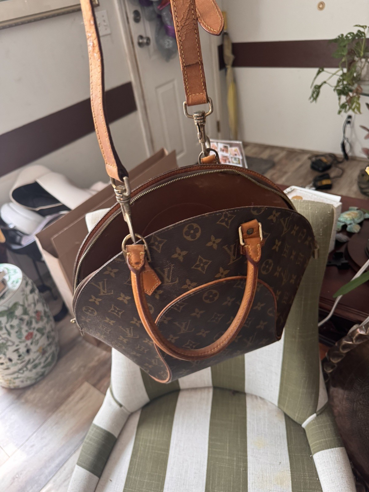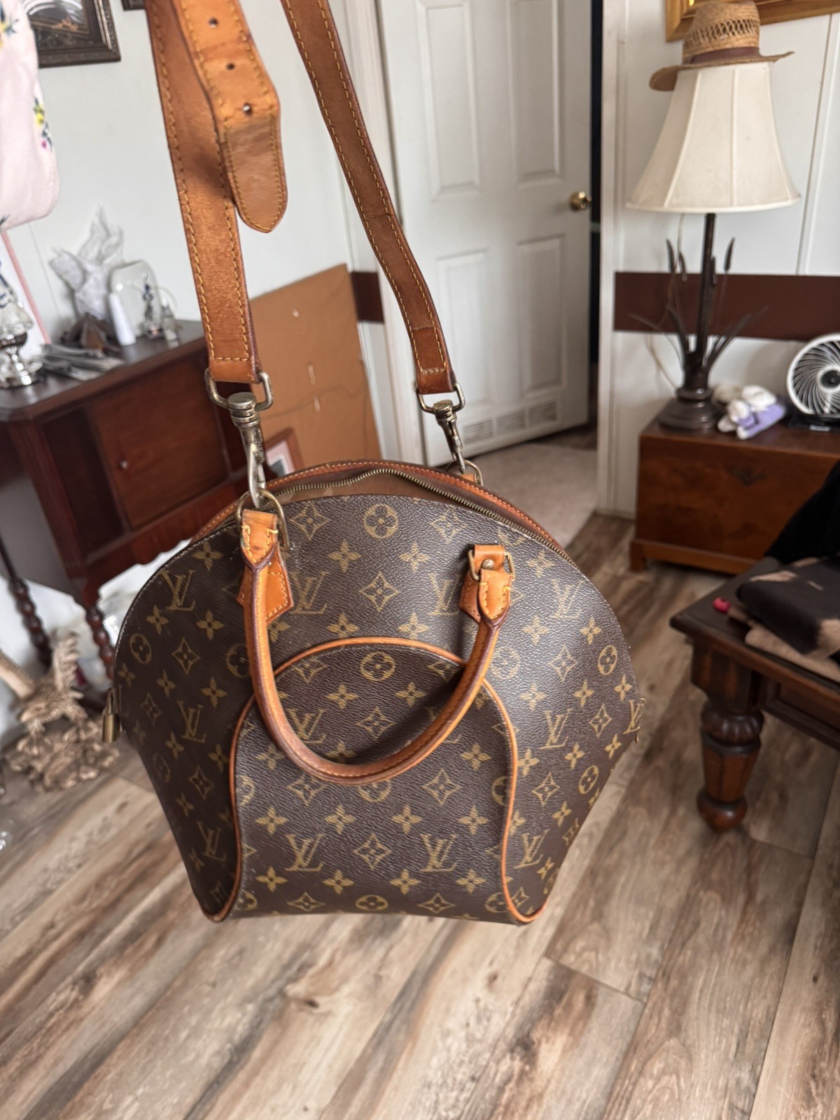 The Louis Vuitton LV Hand Bag Ellipse in Brown Monogram is a stylish and elegant handbag for women. Made in France, this bag features a brown monogram exterior. While it may have rubs and scratches on the leather parts, this handbag is a timeless and luxurious accessory that embodies the iconic Louis Vuitton style. I think this is a bag from 2003 or before.