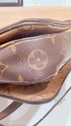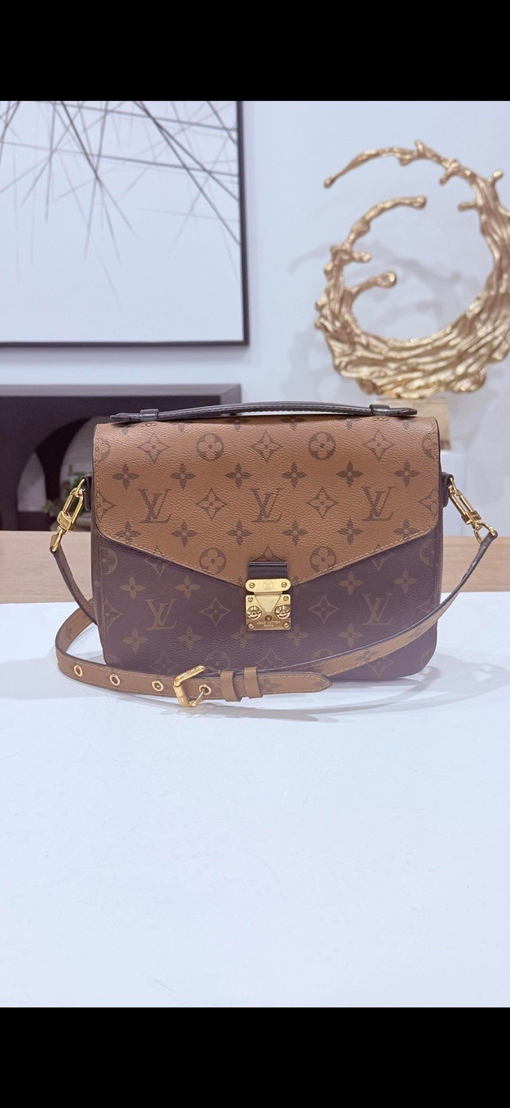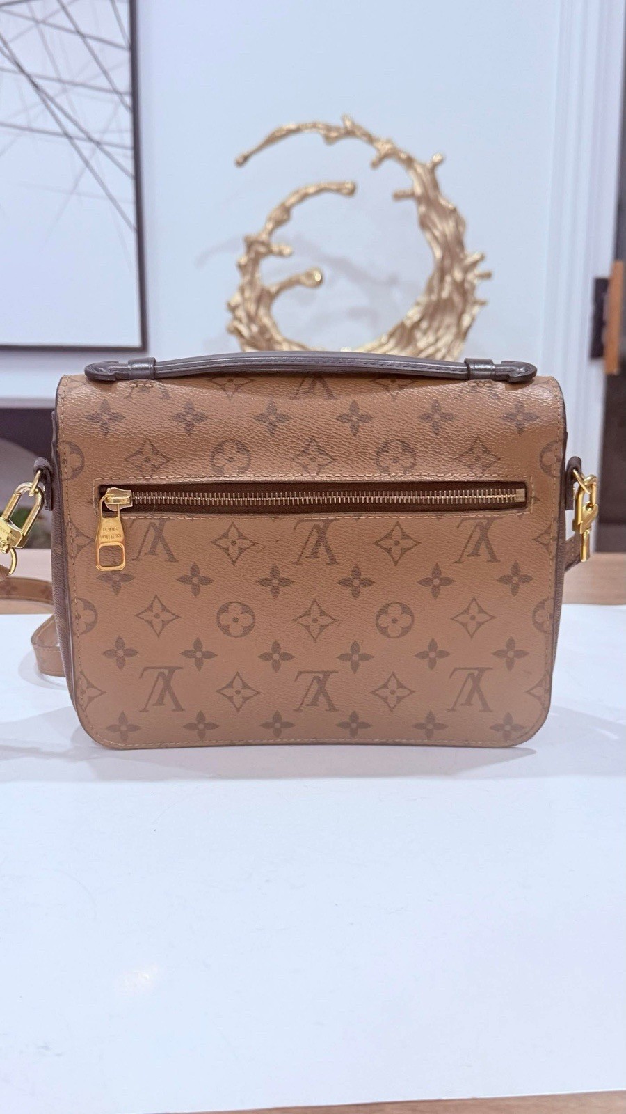 The Louis Vuitton Metis Pochette Reverse Monogram Shoulder Bag is a luxurious and elegant handbag purse designed for women. Made with a combination of canvas and leather materials, this medium-sized bag features a rectangular shape with a push lock closure. The brown exterior color, accented with gold hardware, exudes a classic and timeless appeal. The bag includes a detachable shoulder strap, making it versatile for various occasions such as travel, weddings, parties, casual outings, formal events, workwear, and business meetings. Handmade in France, this designer bag from the Louis Vuitton Métis line is a symbol of luxury and sophistication.