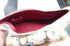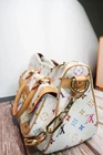 Add a bold pop of color to your collection with this iconic Louis Vuitton Rita bag from the limited-edition Monogram Multicolore line, designed in collaboration with famed Japanese artist Takashi Murakami. Introduced in 2003, this style blends timeless LV elegance with youthful, artistic energy. The white coated canvas base is adorned with 33 vibrant screen-printed monogram colors, complemented by natural vachetta leather trim, gold-tone hardware, and a structured silhouette. Details & Features: Brand: Louis Vuitton Model: Rita Color: White with multicolored monogram print Material: Coated canvas with natural vachetta leather trim Hardware: Gold-tone Handle: Dual rolled leather top handles Strap: Gold chain-link accents with leather detailing Closure: Zip top closure with front buckle flap pocket Interior: Burgundy microfiber lining with interior slip pocket Dimensions: Approx. 13.4" L x 8.3" H x 5.1" D Weight: Approx. 2.1 lbs Condition: AB