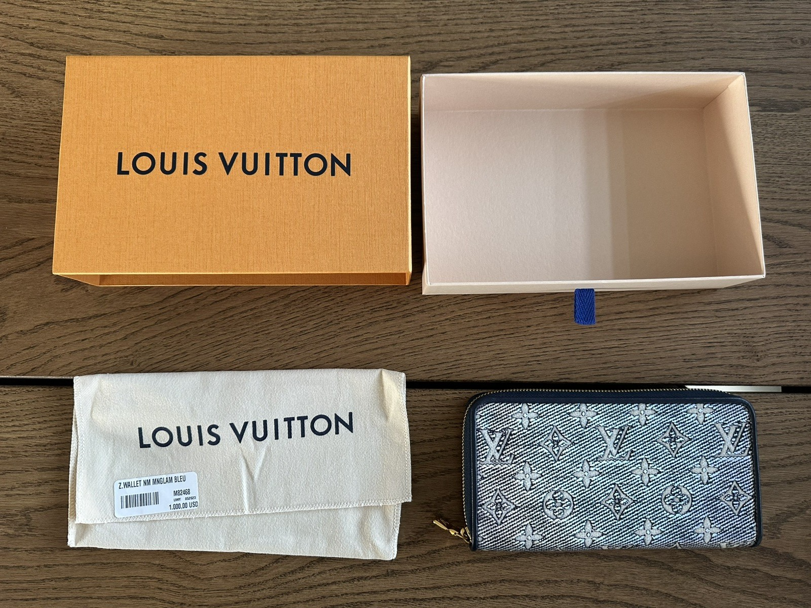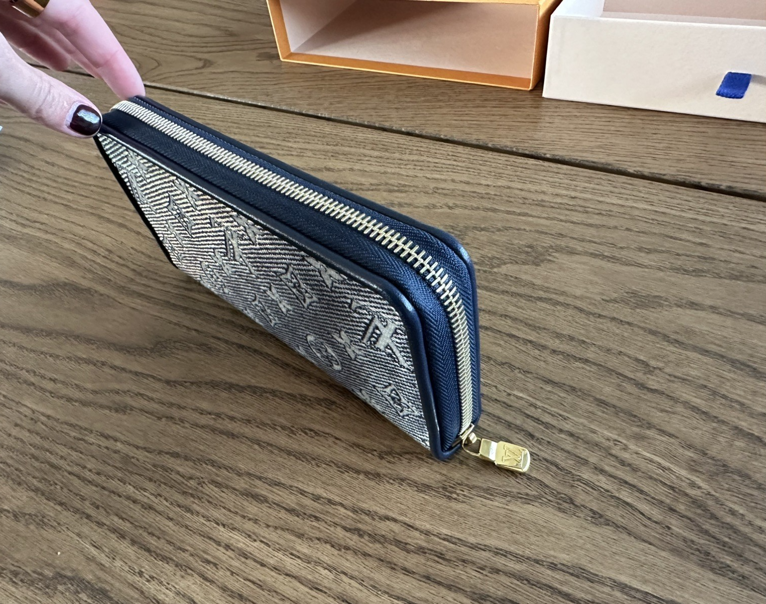 Up for sale is a gorgeous Louis Vuitton Zippy Wallet from the sought-after Monoglam/Monogram Denim Jacquard collection (2023) - a standout piece that’s underrated, eye-catching, and truly unique . This wallet features the iconic LV monogram woven into premium denim jacquard fabric in striking blue and white tones , which appear classic and subtle in the shade and take on a brilliant rainbow/iridescent sheen in sunlight - an effect that really sets it apart from typical denim or monogram wallets. Key Details Authentic Louis Vuitton Monoglam / Denim Monogram Jacquard Zippy Wallet Blue & white denim jacquard exterior with iridescent hues in direct light All-around zip closure with gold-tone hardware - secure and stylish Interior: well-organized layout with multiple compartments, bill sections, zipped coin pocket, and card slots for everyday use Condition: Fabulous - kept with care, no major flaws (see photos) Comes with original Louis Vuitton box and dust bag - great for gifting or collector appeal Why It’s Special This denim jacquard version is a refreshing twist on the classic LV Zippy - blending everyday practicality with a fashion-forward texture and color way that looks extraordinary in the sun. Its denim jacquard material pairs effortlessly with both casual and elevated styles.