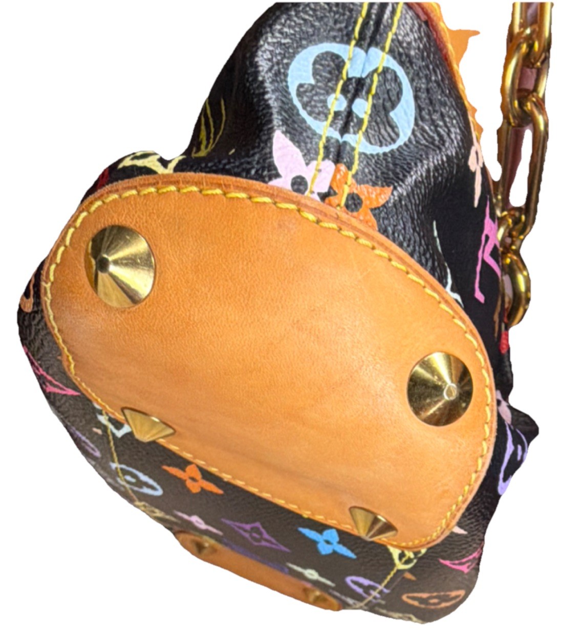 The Louis Vuitton Murakami Multicolore Judy is a stylish rectangular shoulder bag featuring the iconic Louis Vuitton Murakami Multicolore Monogram pattern. Made from a combination of canvas and leather, this luxury bag boasts gold-tone hardware accents and a top handle in tan and gold. The interior is lined with microfiber and includes inner pockets, making it both fashionable and practical for everyday use. The chain strap adds a touch of sophistication to this designer piece, making it a must-have accessory for fashion-forward women.