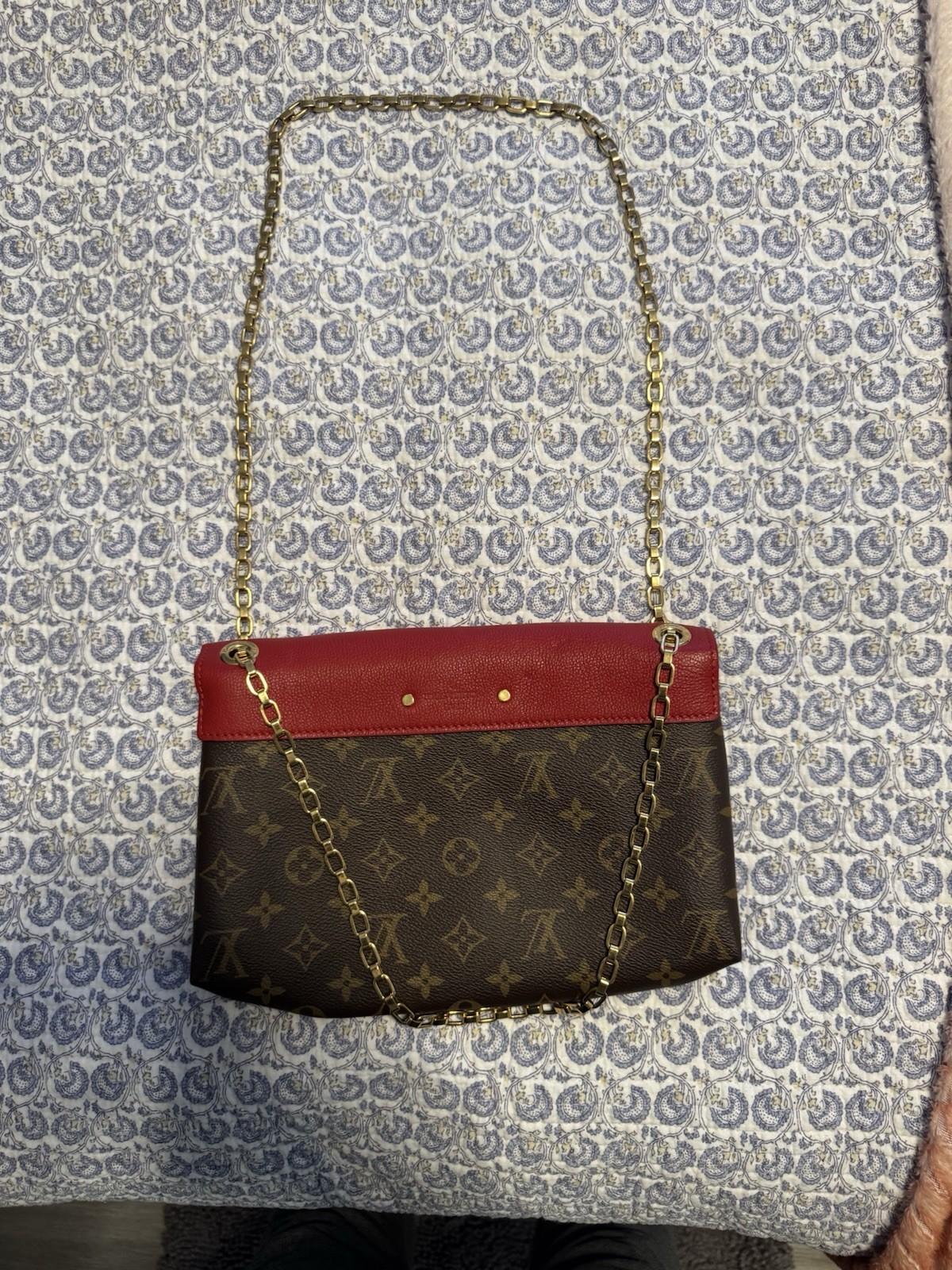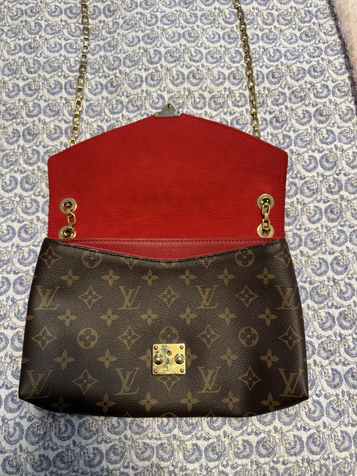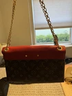 The Louis Vuitton Pallas Chain Cerise Monogram Canvas Bag Calfskin is a stylish yet practical shoulder bag designed for women. Made with a combination of leather and canvas in a vibrant cerise red color with the signature monogram pattern, this medium-sized bag features a gold and red goldhandle/strap in a shoulder strap style. The bag is lined with a luxurious microfiber material in a striking red color, making it the perfect accessory to add a pop of color to any outfit. Made in France by the prestigious Louis Vuitton brand, this bag is a timeless piece that exudes elegance and sophistication. Condition- minor corner wear, minor scuffs, minor creases