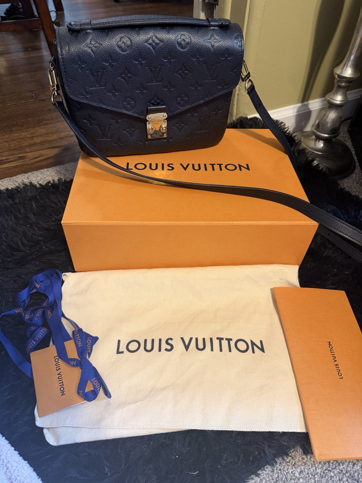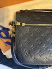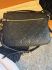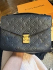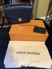 The Louis Vuitton Pochette Métis (Monogram Empreinte) is a medium-sized handbag with a classic monogram pattern featuring hearts, princesses, and other characters. Made of leather with gold hardware, this stylish crossbody bag comes in a sleek Noir exterior color with a gray lining. It includes a matching card holder and comes with its original box and dust bag, making it a perfect accessory for any fashion-forward woman looking for luxury and elegance. Excellent condition! 100% authentic! Both items come with original dust bags and box