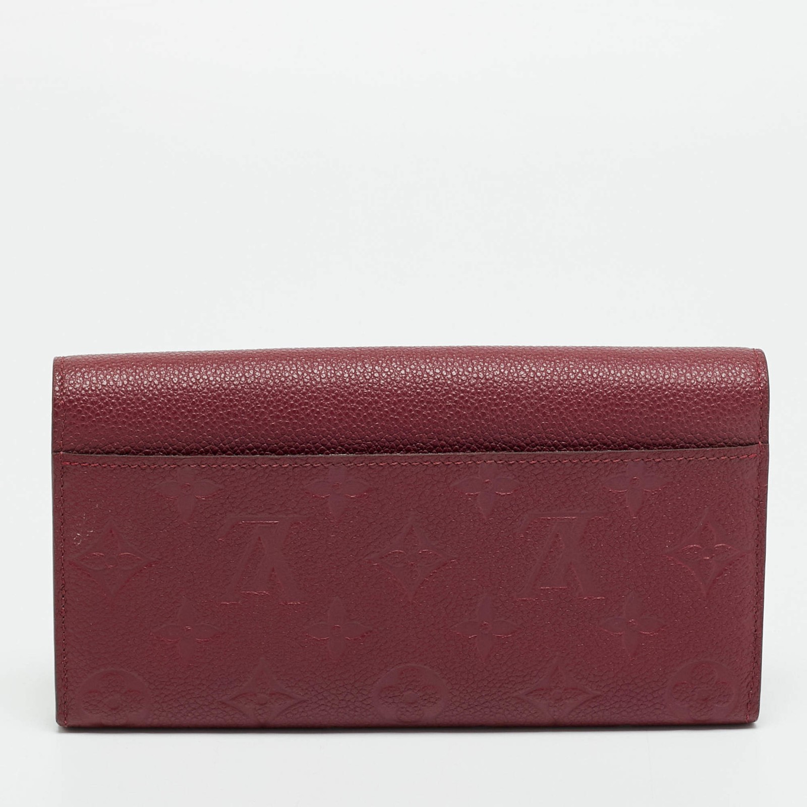 Our eBay Store About Us Contact Us Add to Favorite Sellers Louis Vuitton Sarah Aurore Monogram Empreinte Leather Continental Wallet This Louis Vuitton Sarah wallet is crafted from rich Aurore Monogram Empreinte leather, embossed with the iconic LV motif on the front. The continental design offers multiple card slots, compartments, and a secure flap closure. Both practical and elegant, it’s a timeless piece for everyday luxury. Product Details Brand Louis Vuitton Color Burgundy Includes The Luxury Closet Packaging Material Leather Certified by The Luxury Closet This item has gone through a detailed authentication process overseen by our experts. We offer a lifetime guarantee of authenticity on all our items. How We Check The in-house team of experts at The Luxury Closet is highly trained to verify the authenticity and the condition of the luxury products. They ensure that only 100% authentic items are put on sale.The evaluation process is unique with its own mix of assessment criteria and differs according to the category. Each item is evaluated based on the following combination of hallmarks, hardware, stitching, symmetry, material, craftsmanship, stamping, codes, hologram stickers, and packaging. Our authenticators also check if the items have been modified or amended (e.g., aftermarket diamonds, replaced batteries, repaired bags, etc.) Please note that this handbag may have a perfume scent, as it was stored and packaged in Dubai where such fragrances are commonly used. International Buyers Import duties, taxes and charges are not included in the item price. These charges are the buyers responsibility. Please check with your country’s customs office to determine what these additional cost will be prior to buying.