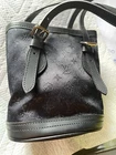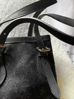 Black satin/leather 2001 pre-owned monogram Little Bucket handbag from Louis Vuitton Pre-Owned featuring monogram jacquard, two adjustable top handles, internal logo patch, leather lining, silver-tone hardware, bucket body and circa 2001. This piece comes complete with a protective dust bag. approx 6" high 5" wide Shipped fast. Please ask questions now before shipping