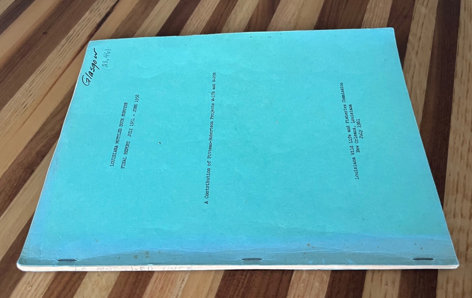 Louisiana Mottled Duck Surveys, Final Report July 1951 - June 1958, Printed 1961. Published by the 'Louisiana Wild Life and Fisheries Commission.' Staple Bound. 11 pages + Tables and Figures. Cool historical work on mottled ducks. The cover has faded due to light exposure. There is a name and number printed in the top right corner of the book. "LA MOTTLED DUCK" has been printed on the spine. The cover shows signs of use, wear, and aging. The interior text is in great shape. SEE PICTURES If more than one book is purchased, I will combine into one shipment to reduce postage costs. Savings will be returned to the buyer.