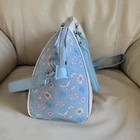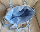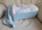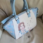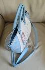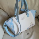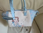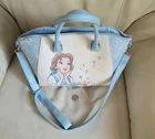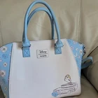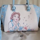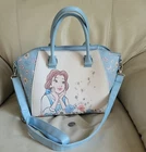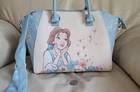 LOUNGEFLY Disney Beauty and the Beast satchel in multicolor design, 2 handles, long shoulder strap. Baby Blue, white and multicolor accents design. This satchel measures around 14" long, 9" tall, and 6" wide. Preowneditem. Huge interior space with open pocket and zipper closure. Polyurethane with nilon lined interior. Large handles and long adjustable shoulder strap. Free local pickup, zip 98687.