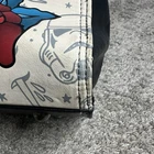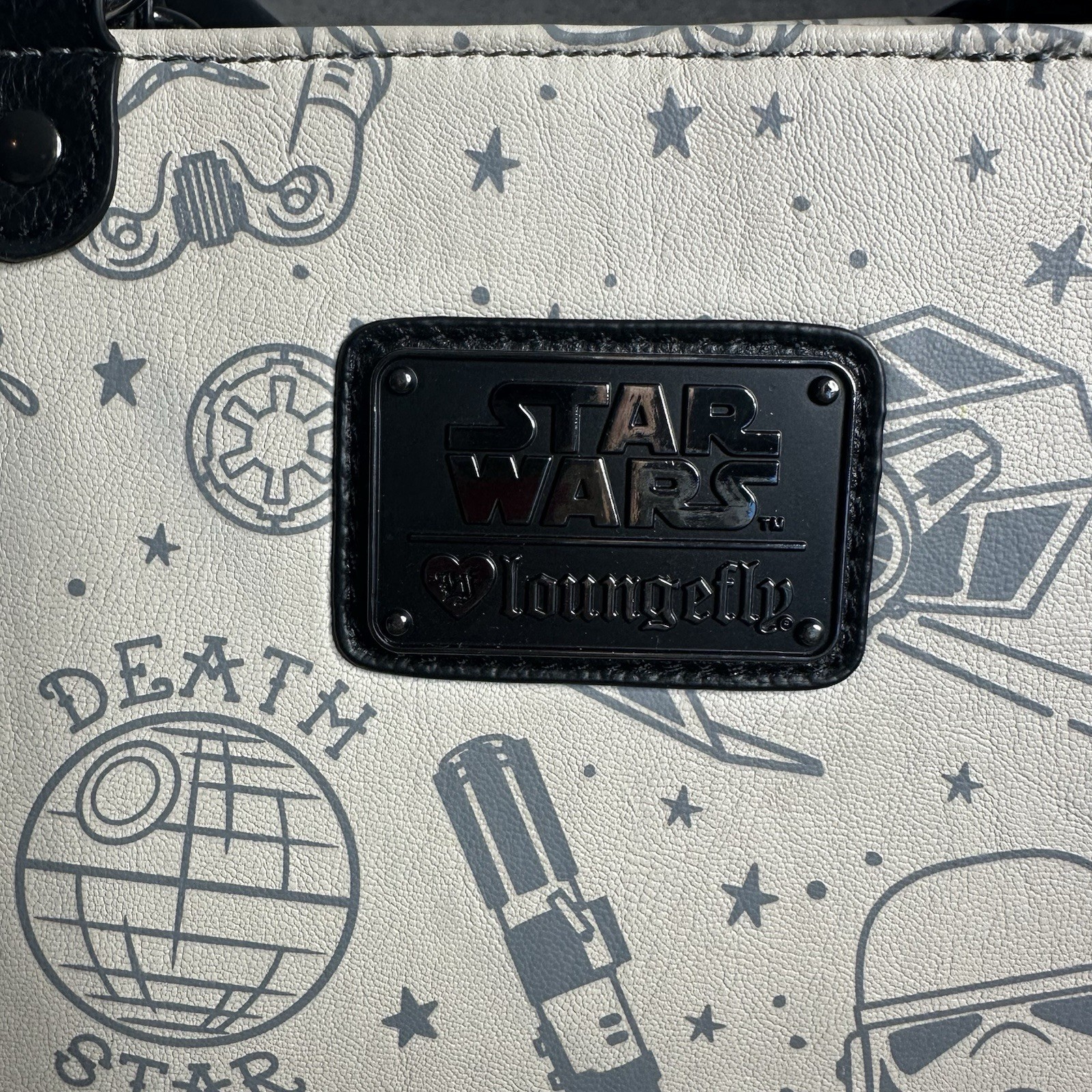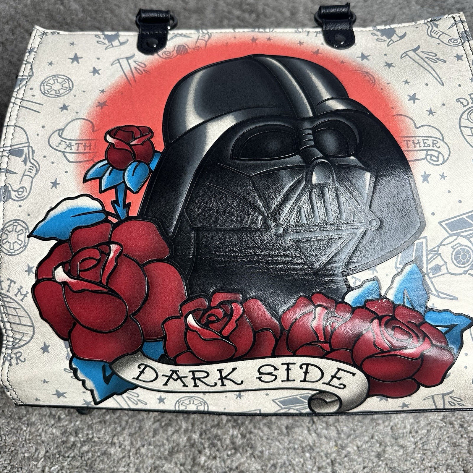 Fun tattoo inspired art for the star wars fan. A very rare and hard to find bag. This one is in preowned. well-loved condition with some flaws (scuffs and stress creases from prior use) as pointed out in the pictures, but very minor and not very noticeable. Type of fabric: Polyvinyl chloride / nylon Source: Imported Clasp type: Zipper Cladding style: Polyester Size: W: 12.75 inch x H: 12.5 inch x D: 6 inch Top zip closure Inside zip pocket and sliding cell phone pocket This bag is in good pre-owned condition. No holes or stains. Pictures show scuffs and peeling on corners. Still in great shape-but some wear. Non smoking home. Disneyland, Disney world, Disney cruise, vacation, trip, travel, Darth Vader,