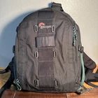 The LowePro Nature Trekker AW is a large camera backpack in black and green nylon. It features accessory compartments for storing a camera, tripod, filters, and lenses. This backpack is designed for photography enthusiasts who need a spacious and protective bag for their camera equipment while on the go.