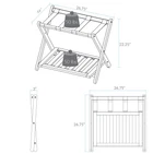 Luggage Rack with Shelf-Natural Welcome your guests with a convenient spot to pack and unpack with this Hotel Style Folding Luggage Rack. Wide 27" top accomodates most luggage. Sturdy construction supports up to 150 pounds on the top shelf and 50 pounds on the lower for worry free use. And the convenient lower shelf doubles as a makeshift shoe rack or simply an extra space to store items off the floor. Folds easily and compactly for storage ideal for busy homes that house frequent visitors. Foldable for easy movement and storage. 27" wide top accomodates most luggage. Convenient lower shelf serves as a shoe rack or extra storage space. Solid wood construction and reinforced heavy duty straps provide increased support. Elevated height makes packing and unpacking easy. No assembly required. Item Dimensions 26.75"W x 16"D x 22.25"H Item Weight 8