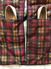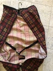 This vintage 1980s hanging, T-Club garment bag can be used alone or as packable in your suitcase to keep your suit, coat, skirt separate and wrinkle free while you travel. It has an over the door or closet hanger once you arrive at your destination hotel. Organizer has separate shoe zipper pockets for your dress shoes. It is brand new unused no tags. Nylon plaid pattern of black, gold and red. Measures 42” long x 20” wide. Folds compact. Very clean with no rips, holes, stains, odors or missing/broken pieces. Ready to go to work for you. Like Hartmann Jaguar