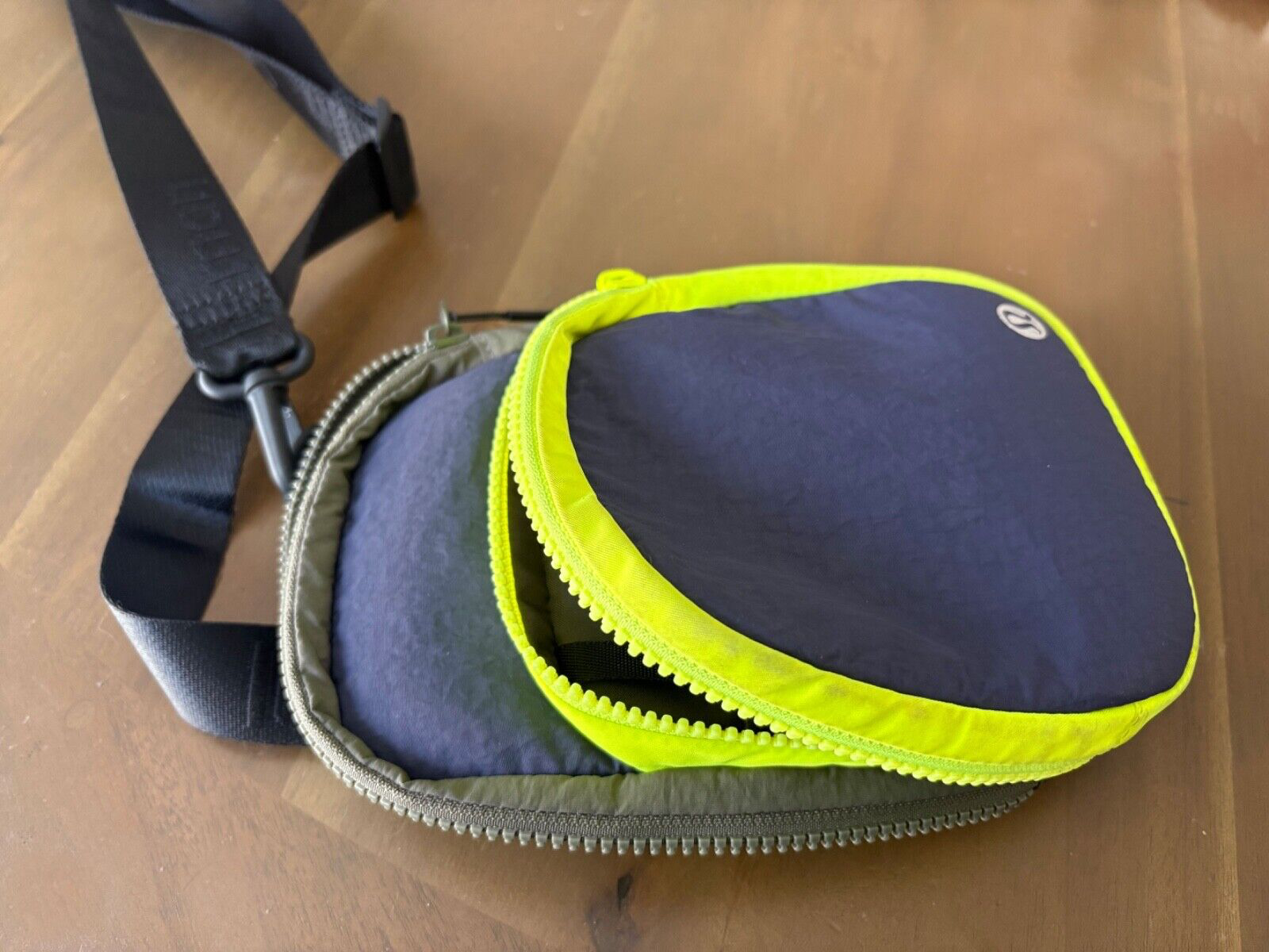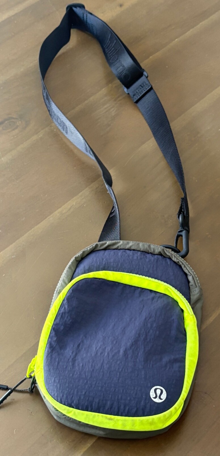 Lululemon Crossbody Bag Classic, sporty and practical for everyday use! Like new, n o markings or signs of use. Colors: Navy Blue with Neon Yellow around outside pocket Grey backing and inside of bag Features: Zip Closure Cross-body detachable black strap Inside: Main zippered compartment with 1 mesh pocket Outside: 1 zippered pocket to secure your valuables with 1 mesh pocket and key strap Dimensions: 8" L x 6" W Strap drop length when attached and not tightened: 23" Fabric and care: 100% Nylon Mesh: 100% Polyester Liner: 100% Polyester Spot clean Thanks for looking! Reach out with any questions.