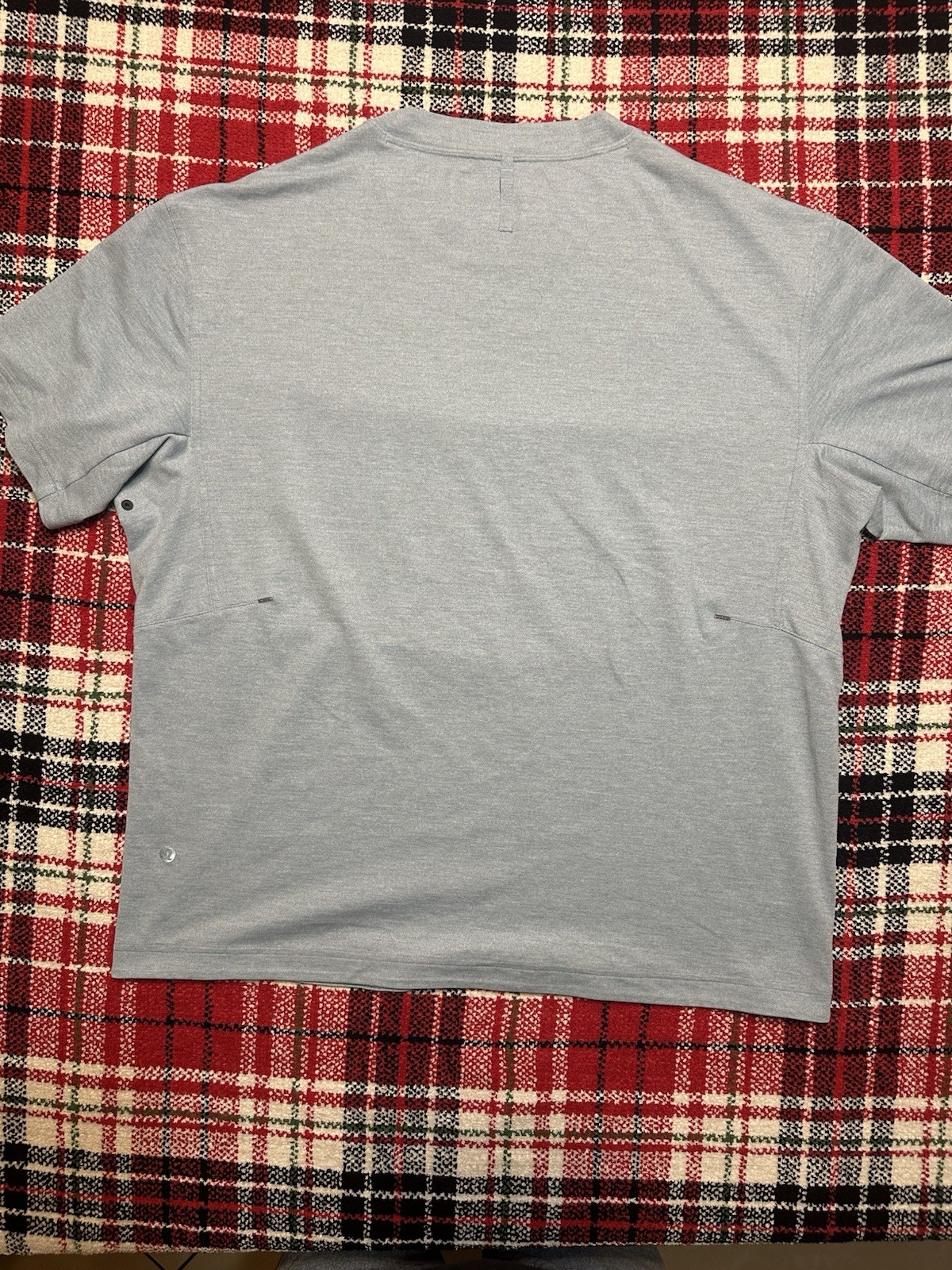 The Lululemon Men's T-Shirt in XL size and blue color is a stylish and comfortable activewear top perfect for gym workouts. Made from a lightweight polyester blend fabric with a crew neck and pullover closure, this shirt features a logo accent and a solid blue pattern. The athletic fit and casual sleeve design make it suitable for activities like gym training and running, while the mild compression level provides added support. Machine washable and with a band collar style, this Lululemon Metal Vent shirt is a great addition to any man's activewear collection for the summer, fall, and spring seasons.