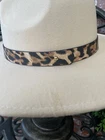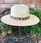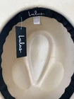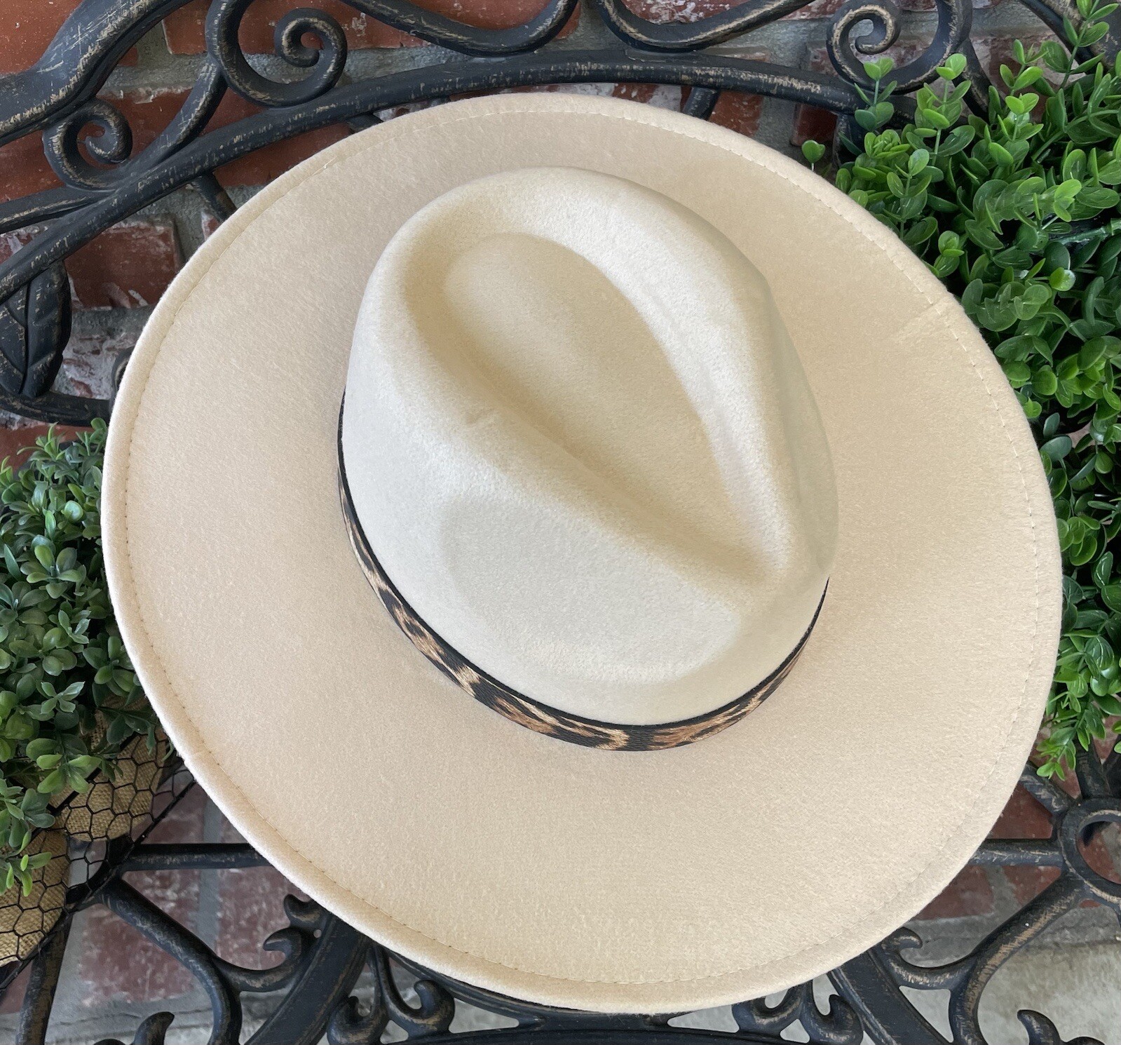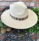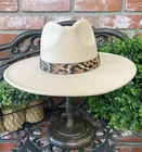 This fedora style wide brim hat is by Lulus. Made of sturdy but soft felt and polyester in a beautiful cream color, the hat has a tear-shaped pinched crown and a 1” wide leopard print faux leather band with a single gold stud accent. The interior of the hat has a 3/4” wide black ribbon band. The dimensions of the hat are 15” wide through the middle, 16” long, 7” wide interior, 5” high crown and 22” circumference. This beautiful and stylish fedora hat is New, has never been worn or displayed and still has the original tag attached. There are no tears, rips, holes, stains or flaws on the exterior or interior of the hat. See all photos. This is the perfect classic and chic fedora hat to wear with all your wardrobe all year long.