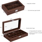A FANTASTIC WATCH BOX FOR ANY COLLECTOR: We are committed to the highest level of quality. This BEWISHOME watch display case is made of top level faux leather, Interior is covered with dark brown flannel, highlight unique beauty while protecting watches from scratching. No matter how picky a man is, he can feel it is unique. Store, display, and protect your valuable wrist watches with our sleek watch box 12 LARGE COMPARTMENTS: Made with 12 watches, each watch section is well spaced to fit both for big and small watches. High quality pillows made of soft sponge cushions, indeformable & soft, protect your watches from dust, damp and shake perfectly. The size for each watch slot is :3.54"L x 1.97"W LARGE REAL GLASS LID: Why not showing your watches to your family and friends? This watch storage box with large viewing window offers premium presentation, you can show off your watches with pride instead of hiding them in drawer. At the same time, solar watch can get light through a window to keep working STAY ORGANIZED & SAVE TIME: Nothing more frustrated than having all watches around drawer and room. This watch organizer creates a single location for your loved watches,you don't have to spend time to search for a suitable watch in the morning and can easily decide which one to wear before going out WONDERFUL GIFT FOR ANY MAN: Are you still searching a perfect gift from all kinds of things for him? This BEWISHOME watch holder with an high end gift box is great personalized ideal for father,mother, husband, son, colleague, friend in your life ,on Father's day, Valentine's day , Anniversary day ,Birthday ,graduation ,etc Product Description Whether you're an avid watch fanatic or just starting the collection,This BEWISHOME watch storage box will either be a perfect choice. This Watch Box will display your watches elegantly & beautifully, the beautiful neat layout and glass top will take your watch collection to a whole new level.With the clear glass top, you can view your items without them being touched, no dust, dirt or fingerprints. Fit For Various Watch Styles And Size The flexible squares are large enough to fit men's giant wrists, but also pliable enough to accommodate women's daintier jewelry if need be. Elegant Gift Box The watch box is a wonderful gift for your special someone. Whether for your husband, father, friend, or for watch enthusiast on Christmas, Birthday and Valentine’s Day,it even can delight the most hard-to-please recipient Large Storage Inside - Material: Faux leather , soft flannel lining - Window: Real Glass - Color: Brown - Product Dimensions (Lx W x H): 13.82" x 21.3" x 3.46"(35.1 x 20.8x 8.8cm) - Glass Window: 11.65" x 6.22" (29.6 x 15.8cm) - Watch Slot Size: 1.97" x 3.54"(5 x 9cm) - Net Weight: 5.5 lbs Package Contents: - 1 x Watch Box - 12 x Removable Pillows Easy Open Buckle Sturdy Metal Hinge Large Real Glass Lid Top Level Faux Leather