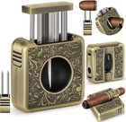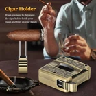 Product Description Elevate your cigar ritual with this Luxury 4-in-1 Cigar Cutter , precision-engineered for aficionados and casual smokers alike. Crafted from premium stainless steel and sturdy zinc alloy , this multifunctional cigar tool combines style, performance, and convenience in one compact accessory. Key Features: Versatile Cutting Options – Includes both a V-cut and guillotine blade , allowing you to achieve the perfect opening for any cigar style and size. Sharp, razor-like stainless steel blades deliver clean, precise cuts that enhance draw and flavor. Fits Up to 60 Ring Gauge Cigars – Designed to handle larger cigars with ease, accommodating up to a 60 ring gauge for maximum compatibility. Cigar Holder Stand – A convenient holder rest, built directly into the cutter, keeps your cigar secure and prevents it from rolling or touching surfaces.
