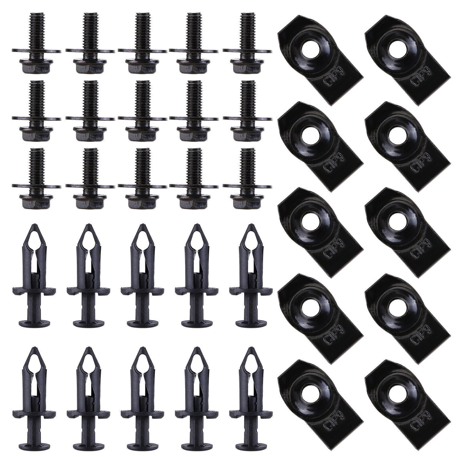 Bolts & U-nut Clips-M6 35pcs Engine Cover Undertray Screws For Ford Truck Body Specification: Item Type: Fastener & Clip Material: metal, plastic Color: Black Size: as picture shows Please confirm model and size before ordering! Package includes: 10pcs Extruded U-nuts 15pcs Body Bolts with Built-in Fender Washer 10pcs Nylon Push Clips Feature: 1. Premium Carbon Steel & Plastic: Engine Undertray Clips Screws are made of high-quality carbon steel material, which is not easy to rust, anti-oxidation, anti-vibration, strong and wear-resistant, the screw thread are clear and smooth, and the U-shaped spring clip has good elasticity and durable. 2. Extend Engine Life: Undertray Cover Fastener as effective car body trim clips to prevent mud from splashing on the body when the car is running, not only keeps the body clean, but also protects the engine from being hit by gravel, effectively prolonging the life of the engine, it is a good choice for damaged screws replacement. 3. Easy to Use and Replace: Car trim clips are ergonomically designed for easy grip and use, push-on car retainer clips, easy and quick to install, easy to replace damaged parts, less time and effort than going to the local garage to replace the retaining clips, lightweight and saving space, easy to carry and replace in time on the go. Payment Delivery details Returns & Exchanges About us Contact us Payment Item will be shipped out within 24-48hours after payment Delivery details √ Item will be shipped out within 24-48 hours after payment. √ We will ship all orders asap. from NJ via USPS or UPS.( No service on Weekend and public holidays). √ Delivery time within the U.S. is usually just 3 to 5 business days, however in rare cases it could take 5 to 7 business days. √ No combined shipping discount offered and no pick-up service. Returns & Exchanges √ We offer 30-days rerturn service. √ A Merchandise Authorization Number (RMA#) is required for all need returned packages (After we have a fully communication). Please contact us to get an ""RMA"" number before you ship your items back to us. Items returned without an ""RMA"" number would be ignored or delayed in processing. Returns/Exchanges will not be accepted unless authorization has been issued by our customer service. √ All return products should be with all accessories included. About us We commit to provide you the best Innovative、Quality Products & Professional Service. Contact us Work Time: Monday - Friday, we will reply whithin 24hours on week day. √ Customer satisfaction is very important to us and our feedback rating reflects this satisfaction. If you have any question or concern, please contact us via ebay message. √ If you are happy with your purchase, We appreciate you will take a moment to leave POSITIVE Feedback for us upon receipt of your item. √ Positive feedback will be left automatically to customers when your payment is cleared.