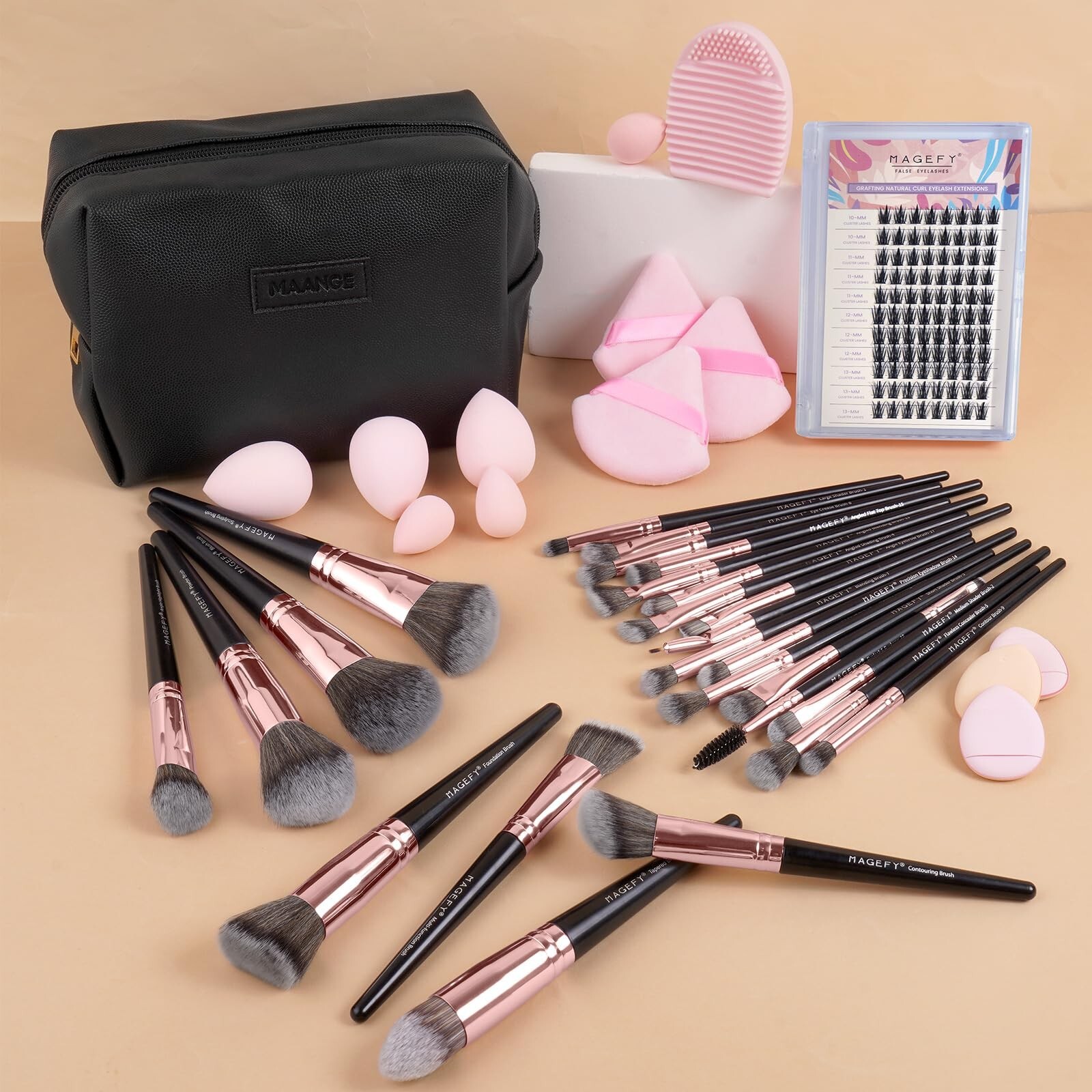 MAGEFY Makeup Brush Set 40 Pcs Makeup Tool Set Premium Synthetic Foundation Powder Concealers Eye shadows Blush Makeup Brushes(Black) Product Details Brand: MAGEFY Recommended Uses For Product: For Primer, For Contouring, For Blush, For Face Mask, For Foundation, For Blending, For Mascara, For Highlighting, For Tanning See more Color: Black Skin Type: All Number of Pieces: 40 Age Range (Description): Adult,girl,women Manufacturer: MAGEFY Package Dimensions : 9.8 x 6.57 x 2.68 inches; 15.87 ounces Manufacturer : MAGEFY Country of Origin : China Package Included: 25pcs professional makeup brush set With a makeup bag, 6pcs beauty blender, 3pcs triangle powder puff, 3pcs mini thumb puff,1pcs cleaning mat and a eyelashes set. Premium Synthetic Fiber: The handles of cosmetic brushes are made of high-end alloy and wood material. The bristles are well made of soft and silky nylon, ensured for long time use. All the brushes are fine and dense, suitable for even the most sensitive skin. High Standard Handles with Label: The make up brushes are designed with ergonomic handles for comfortable and precise handling. Will not fall apart. Non-slip, strong grip. Printed with brush name labels on each handle, help to distinguish each brush. Stylish Makeup Bag: The size of makeup pouch is approx. 6.7inch x 3.3inch x 5.1inch. One main compartment with 3 small pockets neatly organizes your makeup. One large compartment easily holds travel-size toiletries products. Side pockets holds your concealer, lipsticks or other small items. Perfect for Gifting: MAGEFY makeup brush set provides a complete makeup solution. The 42Pcs makeup tool set caters to a variety of makeup application need, from foundation and power to face and eye makeup, ensuring a complete look. MAGEFY cosmetic brushes are handcrafted with synthetic bristles that are ultra-soft yet sturdy. Comprehensive Makeup Brush Set This set includes 25pcs makeup brushes, the professional makeup brushes are designed for ease of use and precision. The ergonomic handles provide a comfortable grip, ensuring your hands won't tire during application. In addition, we also prepare a makeup bag, 6pcs beauty blender, 3pcs triangle powder puff, 3pcs mini thumb puff, 3pcs face wash headband wristband set and a eyelashes set. This set is a good choice for beauty lovers. Soft and Comfortable Bristles The bristles of our makeup brush set are made of high-quality fiber. The bristles are rich, soft and fluffy, and will not fall off easily. They can better grasp the powder and spread evenly on the face, which not only makes your makeup more natural, but also gentle and non-irritating to the skin. Multifunctional Use Each product in our makeup brush set is very practical. It can not only meet your makeup needs for eyes, cheeks, and lips, but also apply to a variety of cosmetics, including foundation, BB cream, powder, concealer, isolation liquid, and can be used for a long time. Intended for makeup beginners and enthusiasts as the makeup brush kit is easy to use and superior in quality at an affordable price, a complete assortment to allows you to keep your makeup. and Please wash it before usage.