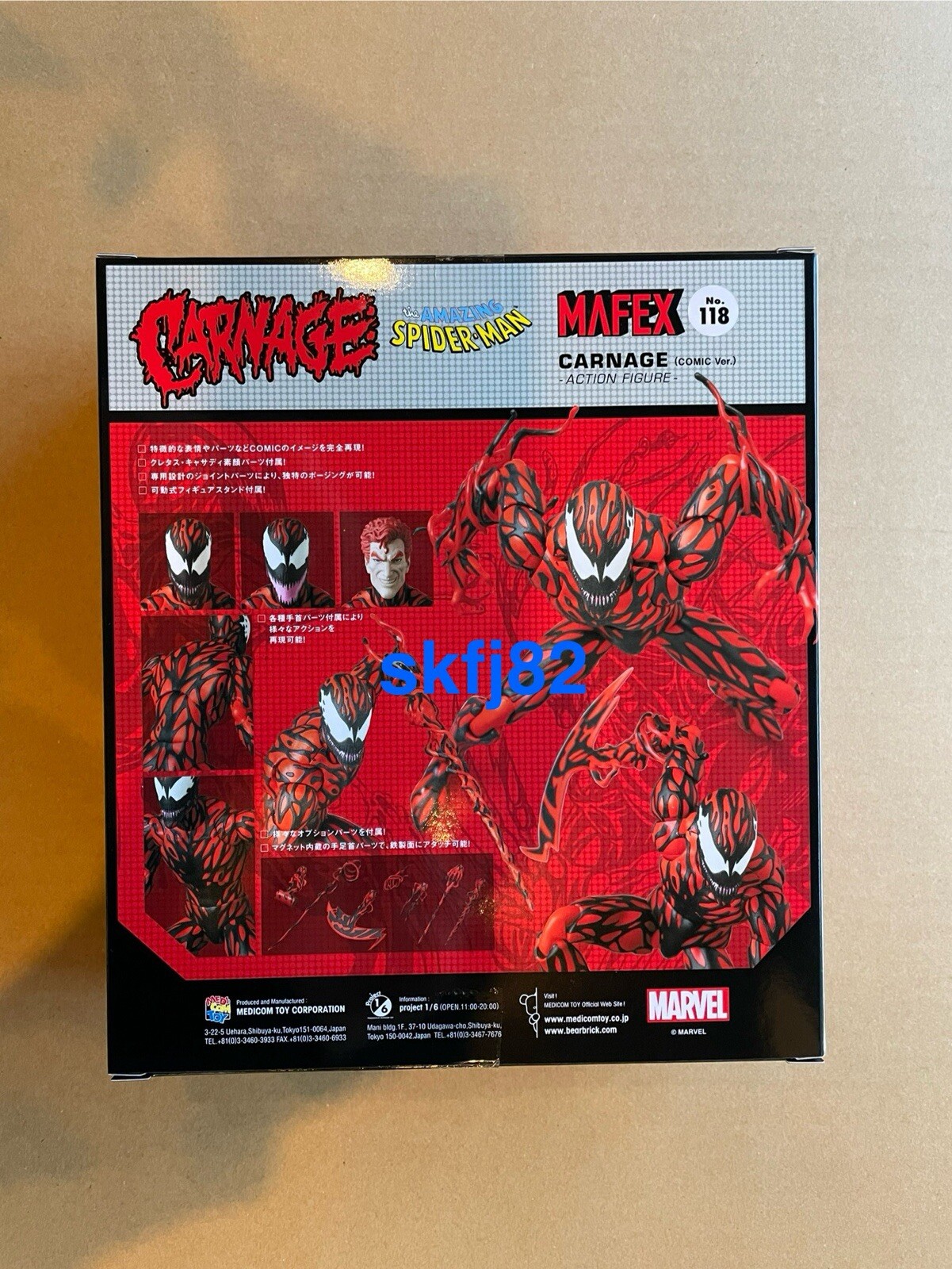 Description Re-release MEDICOM TOY MAFEX No.118 CARNAGE COMIC Ver. Figure Venom Spider-man Manufacture : MEDICOM TOY Item Condition : Brand New Size : 16cm Our Products are 100% Authentic. Shipping Worldwide Shipping Economy Shipping : $10.8 (SAL 14-21 days ) None of Tracking Number Standard Shipping : $19( AIR MAIL7 -14 days ) Tracking number EMS Shipping : $29 (EMS 3 -7 days ) Tracking number Return Policy 14 days money back, buyer pays return shipping. Return Shipping is paid by buyer and not refunded. About Us My store products is purchased in Japan. Our Products are 100% Authentic. I hope your happy bidding. International Buyers Please Note Import duties, taxes and charges are not included in the item price or shipping charges.These charges are the buyer's responsibility. Please check with your country's customs office to determine what these additional costs will be prior to bidding/buying. These charges are normally collected by the delivering freight (shipping) company or when you pick the item up -do not confuse them foadditional shipping charges.