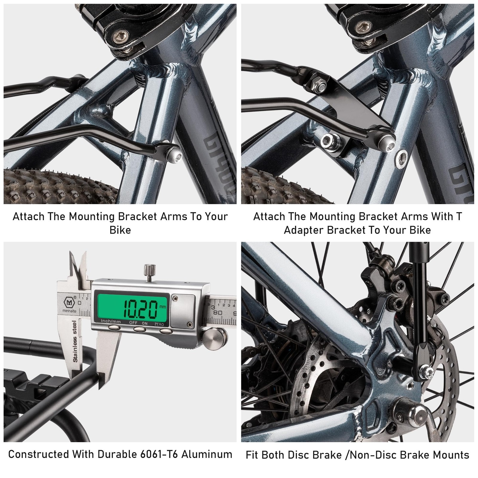 bike cargo rack COMPATIBLE WITH MIK SYSTEM-- Compatible with MIK, standard trunk bags, and panniers. Our rear bike rack equipped with a MIK adapter plate allowing easy mounting and dismounting of your top mounted bag or baskets. Easy on. Easy off. Make life easier and your bike cooler. PANNIER RACK FOR TOURING-- Whether you use your bike to commute, run errands or take longer trips, you'll need a way to carry essentials, from a small repair kit to full-on camping gear. The rear rack takes the prize as the easiest and most effective way to carry things on your bicycle. Saving your back from carrying heavy loads, rear racks allow you to carry much more cargo on the road with you. FIT ALMOST BIKES--The rear rack is adjustable, allows to fit most adult bikes. Compatibility with 26"-29" and 700c wheels, Disc Brake and Non-Disc Brakes. So you can use it on mountain bikes, touring bikes and even gravel bikes. SOLID & STURDY--The rear rack work with virtually all panniers, and MIK mounting system provides secure, integrated mounting with compatible bags. Made of durable, but lightweight 6061-T6 aluminum that is very stable even under weight. The design of our rear bike rack is simple and elegant, but the strong rack can carry loads up to 27 kg/ 60lbs. EASY TO INSTALL--The bike rear rack comes with all the bolts and mounting brackets you need. Comes with instruction, it only takes a few minutes to assemble the bike cargo rack. Also Plenty of adjustments can be made to make it fit your bike. As you ride around, check the screws fastening your bike rack on occasion. If they become loose, they can rattle out. Please tighten them. MAKE SURE IT FITS YOUR BIKE BEFORE ORDER--Make sure if your bicycle have eyelets next to the rear hub and eyelets in the seat stay(or 1 eyelet can use T adapter). Our rear rack requires the bicycle to have installation eyelets for the rear rack to ensure its load-bearing capacity.