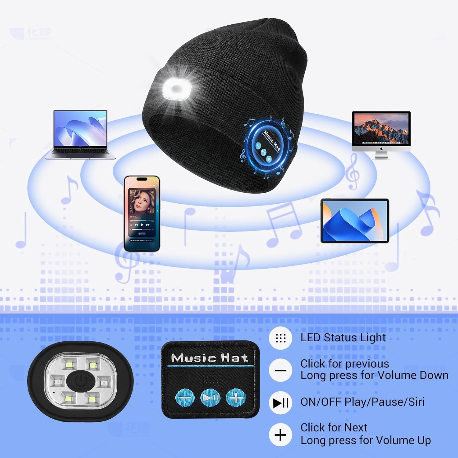 Free eBay listing template designed by dewiso.com MUSIC Beanie with Light and Bluetooth Headphones, Rechargeable Headlamp Beanie Hat, Gifts for Men & Women FREE AND FAST SHIPPING! [Stable Bluetooth Connection]: This beanie hat features advanced Bluetooth 5.4 technology for a stable connection with extremely low latency. It pairs easily with phones and tablets. The 32mm speaker delivers clear, crisp audio for music and calls. Designed for skiing, dog walking, commuting and more. This bluetooth beanie with light requires no frequent connection adjustments. A thoughtful gift for men and women who love outdoor activities. [Bright LED Lighting]: Built-in six high-performance LED lamp beads, luminous flux 125lm, color temperature 7500K. This LED beanie hat features three lighting modes: medium brightness, high brightness, and SOS mode. Its powerful illumination brightens your path and expands your field of vision in low light, significantly improving nighttime safety.This winter headlamp cap suits camping, working, and various outdoor activities. [Long Lasting Rechargeable Battery]: Equipped with a 200mAh lithium battery supporting 3V charging via USB. This Bluetooth beanie hat efficiently powers music playback, calls, and LED lights. It provides stable performance during winter hiking, snow shoveling, and other outdoor activities. Keep the music and lights going on all your adventures. [Simple Control Buttons]: Simple controls include single tap to play pause answer calls or skip tracks. Long press adjusts volume or ends calls. Single tap turns power on and off. These glove-friendly controls make this hat convenient for outdoor use. The bluetooth beanie for men and women is user-friendly. [Removable Modules & Washable Design]: The Bluetooth speaker and LED light module can be easily detached for safe cleaning. The 100% soft skin-friendly acrylic beanie is washable. This practical design ensures long-lasting durability and simple maintenance. [Warm Comfortable & Ideal Gift]: Made of 100% soft skin-friendly acrylic fiber keeping you warm and comfortable in cold weather. This beanie with light fits snugly on the head and is suitable for long winter wear. A thoughtful gift for Christmas Birthday Valentine's Day or Thanksgiving Day for men and women who love outdoor activities. Product We offer a 30-Day Return Policy on items which you are not completely satisfied with. You have the option for a full-refund or an exchange of the item. No returns are available on items shipped outside of the US . Shipping We offer Free Shipping to the US and ship within 2 business days of payment, usually sooner. We use UPS express shipping. That's why your products are usually delivered within 3 days . Contact We try our very best to make sure every customer is completely satisfied. If there's a problem , message us! We're happy to help. 24/7 live chat available.