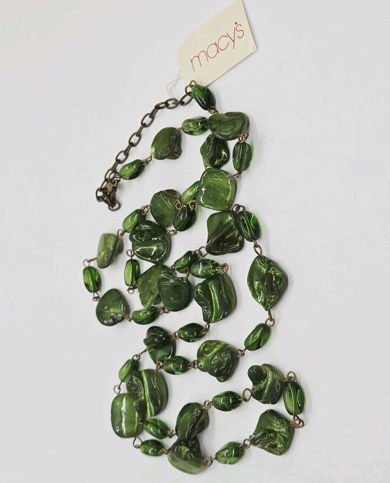 Multicolored Green Varying Size Bead Make This Linked Necklace a Stunning Show Stopper. Can be wrapped around twice for a double layer look. Lobster Claw Closure 41 in end to end