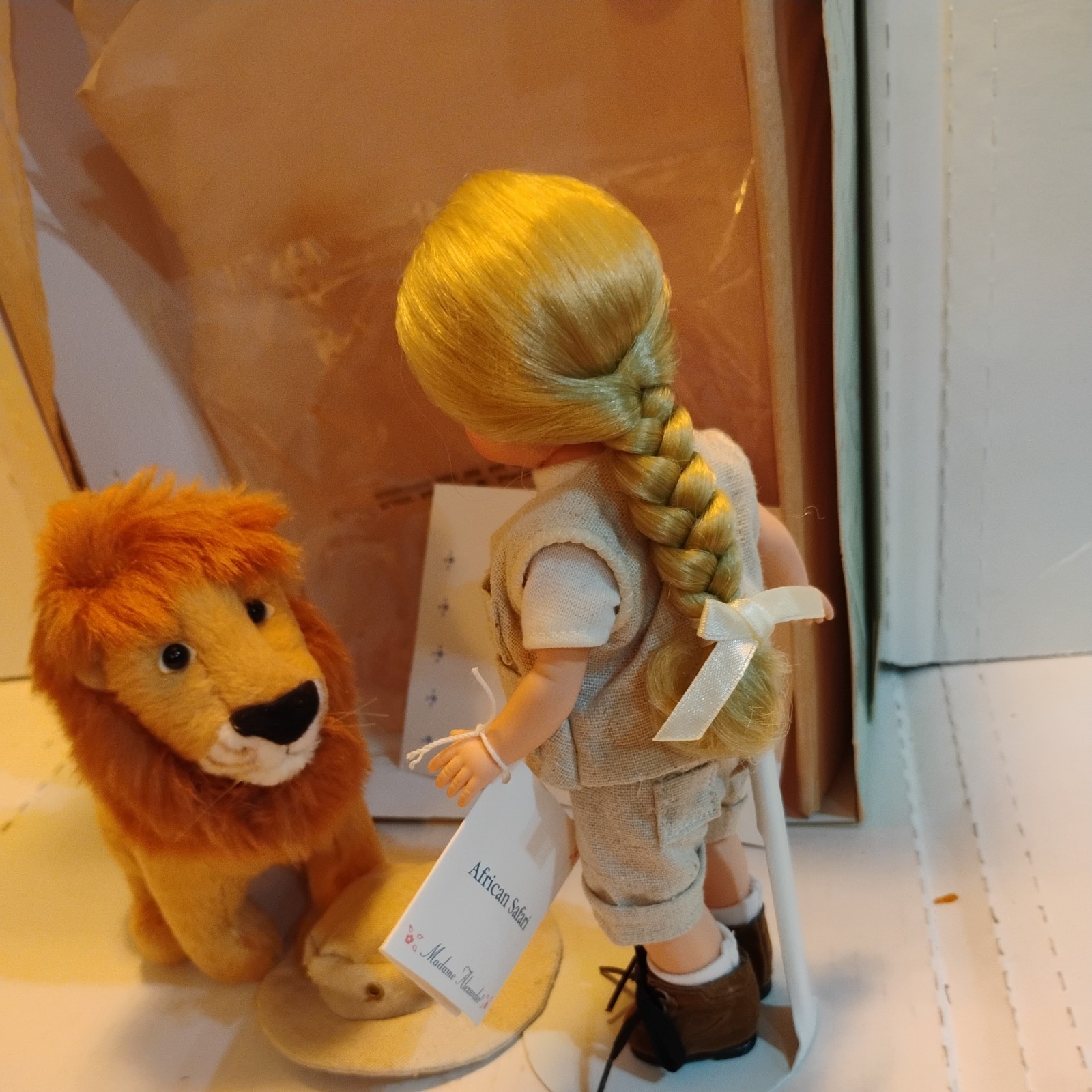 The Madame Alexander African Safari Blonde 33501 doll is an 8-inch baby girl doll with blonde hair, brown eyes, and a light complexion. It comes in a box with a tag, as well as a plush lion and hat accessories. This doll is perfect for young children who enjoy playing with dolls and creating imaginative play scenarios, especially those interested in animals and safari adventures. With its detailed features and included accessories, this doll set provides hours of fun and creative play for kids.