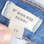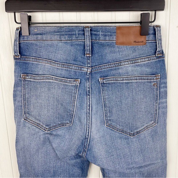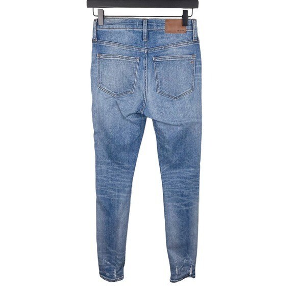 Madewell 9" High-Rise Skinny Jeans: Destructed-Hem Edition Lean and legs-for-days sexy, our 9" high-rise jeans have an extra layer of holds-you-in sorcery in front, thanks to our supersleek Magic Pockets. Made in one of the world's most environmentally friendly factories, these pale indigo skinnies were hand distressed to look like a wrangler's well-loved pair (cowboy boots create just those kind of abrasions at the hems). Lighter wash denim with some intentional distressing, rips, tears. Sit above hip, fitted through hip and thigh, with a skinny leg. Premium 98% cotton/2% elastane denim Machine wash. Item J0513 Size 25 Excellent pre-owned condition Approximate measurements laying flat: Waist: 13.5” Rise: 9” Inseam: 29”