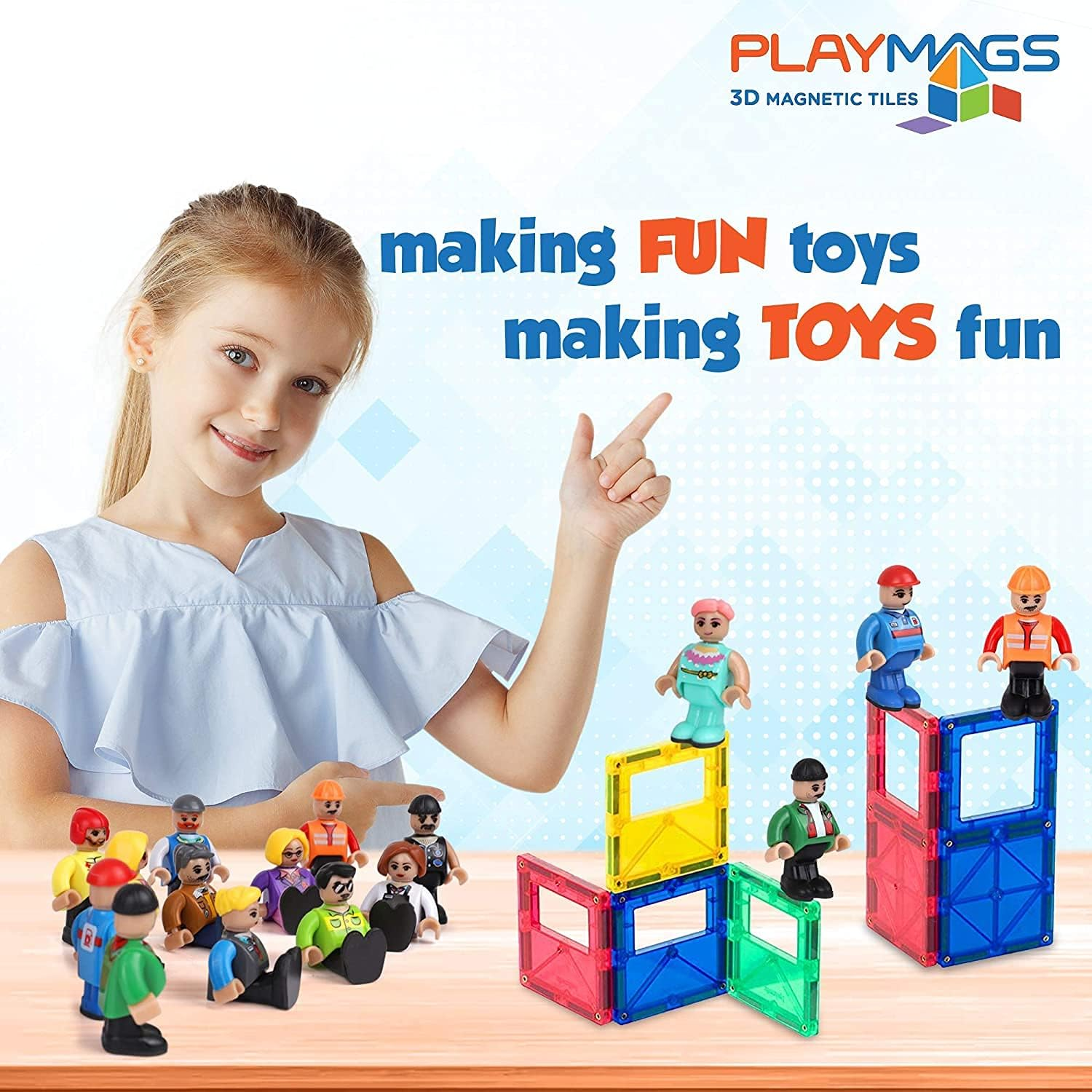BULK SET: Complete community block figurines playset features a variety of 15 sized characters including family members, workers & more, these little magnet people are compatible with other leading brands. CAPTURE IMAGINATION: Discover endless possibilities as you encourage your childs imagination. These magnetic figures are made to accommodate childrens sense of wonder and engage them in their play. QUALITY AND SAFETY: Were committed to providing you with the best Stem learning toys on the market! We abide by the USTM and American Safety standards, our products have been tested to ensure safe play. GREAT GIFT IDEA: Our magnet tiles expansion pack comes wrapped in a special plastic box packaging making a perfect gift for any inquisitive child aged 3 years and above. Get them for any holiday or celebration! Product Description Playmags Magnetic Play Figures Pick Your Profession. Children love dreaming about their future careers, and these magnetic figures make exploring their future fun and educational! Each set includes multiple life figures and professions, all equipped with magnetic feet to carry them around their magnetic tiles building blocks cities. Figures have moveable body parts and a head that turns 360 degrees as well. What You Get: 15 assorted mini people [male and female] Electrician Gas Station Attendant Boy Robber Girl Nanny News Reporter Waitress Teacher Flight Attendant Policeman Construction Worker Baseball Player Sushi Chef Fireman Specs and Details Total pieces: 15 Color: Assorted No assembly required compatible with other leading brands Recommended for ages 3+ Disclaimer: Playmags Figures will only stick to the Playmags tiles or other popular brands. They will not adhere to other metals.