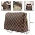 Makeup Bag Checkered Cosmetic Bag Large Travel Toiletry Organizer for Women Girl Product Features: Lining: Polyester Zipper: Metal The details determine the quality, high-quality PU leather material, soft, scratch-resistant, water-proof, and protects your cosmetics and toiletries from stains and wate : External size: 11.5"L x 4"W X 8"H Inner zipper pocket: 6.5"L x 4.7"H Portable and lightweight design, suitable for everyday use or travel, put in a suitcase or backpack, save space, convenient and practical 1 x checkered makeup bag Description: Our cosmetic bag is made of high-quality PU leather, vintage plaid, and precise sewing stitches, bringing a stylish look and slim body. The clear texture of leather, the comfort of leather, and its beautiful appearance reflect the beauty of leather. The portable hand-held cosmetic bag is both versatile and convenient and can be used as a cosmetic bag, toiletry bag, or wash bag. A simple checkered design creates a retro and light luxury style. When you attend a masquerade or you stay at a hotel, you can get good help. Waterproof & easy care: The makeup bag is made of high-quality waterproof vegan leather, which is soft, scratch-resistant, and shiny, and stains can be wiped off with wipes. The waterproof and durable fabric protects your gear from splashes, and the zipper is rust-proof-all-metal anti-oxidation, and durable. Large size: Checkered makeup bag organizer can hold all your essentials, such as cosmetics, makeup tools, lipstick, eye shadow, or men's shaving kit. High capacity: The cosmetic bag is equipped with a main pocket, a zipper pocket, and a side pocket x2. The design is reasonable, and convenient for sorting and storing so that you can quickly find the items you need. Suitable for all kinds of daily life or travel. Multifunction brown grid pattern design, golden zipper, simple and advanced color matching. It can be used as a cosmetic bag, wash bag, wash bag, storage bag, commuter bag, or liner bag. Going to work or attending a fancy dress party or staying in a hotel can be very helpful. Cute gift: This retro cosmetic pouch has a classic color matching and a simple and elegant shape. It can be used as a Birthday gift, Mother's day gift, and Party gift. This portable cosmetic bag is a great gift for women or men!