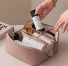 Size : 9.3*4.1*4.3inches This cosmetic bag features a unique middle-fix design to prevent your makeup from moving around. It also comes with a detachable mesh pouch for extra storage. The wide-opening design allows you to easily see all of your cosmetics, and the built-in compartments help you keep everything organized. The bag is made of high-quality, waterproof polyurethane material and features a comfortable grip handle and a custom metal zipper. It comes with protective packaging to ensure that it arrives in perfect condition.