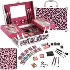 All-In-One Teen Makeup Kit: Includes 7* eyeshadow palette (28 colors), 5* lip balm palette (20 colors), 2* blush, 4* eyeshadow cream, pink glitter gel, silver glitter gel, 8* brushes, eyeliner, lipstick, mirror, leopard cosmetic bag, and a tag, all neatly packed in a stylish makeup case Stylish & Compact Cosmetic Case: Measuring 10.4 x 6.5 x 3.74 inches, it is spacious yet portable for on-the-go use. The top handle ensures effortless carrying with a comfortable grip. Additionally, it boasts leopard wild style and a reinforced aluminum frame for durability and standout style Suitable for All Skin Types: Our makeup kits cater to almost every age and are completely free from phthalates, parabens, synthetic fragrances, and animal testing, ensuring they are gentle on all skin types. Patch test on a small area of skin before use in case of allergies Ultimate Color Combinations: With a wide array of options, including warm and cool tones, matte and shimmer finishes, pink and silver glitter gel, as well as eyeshadow cream, you can create stunning color combinations and achieve a flawless full-face makeup look. The included cosmetic bag ensures easy transport for quick touch-ups Ideal Present for Beginners: All-in-one cosmetic carry case with a complete makeup kit for professional salons, at-home makeup, and travel. An ideal present choice for girls, beginners, daughters, granddaughters, tweens, and teens on any occasion