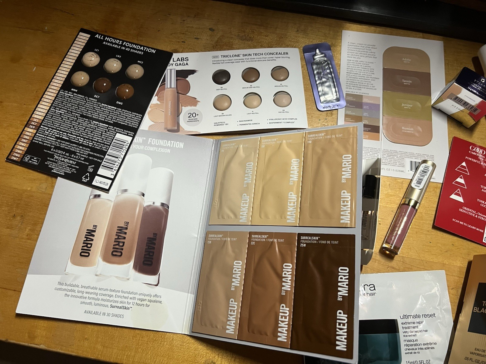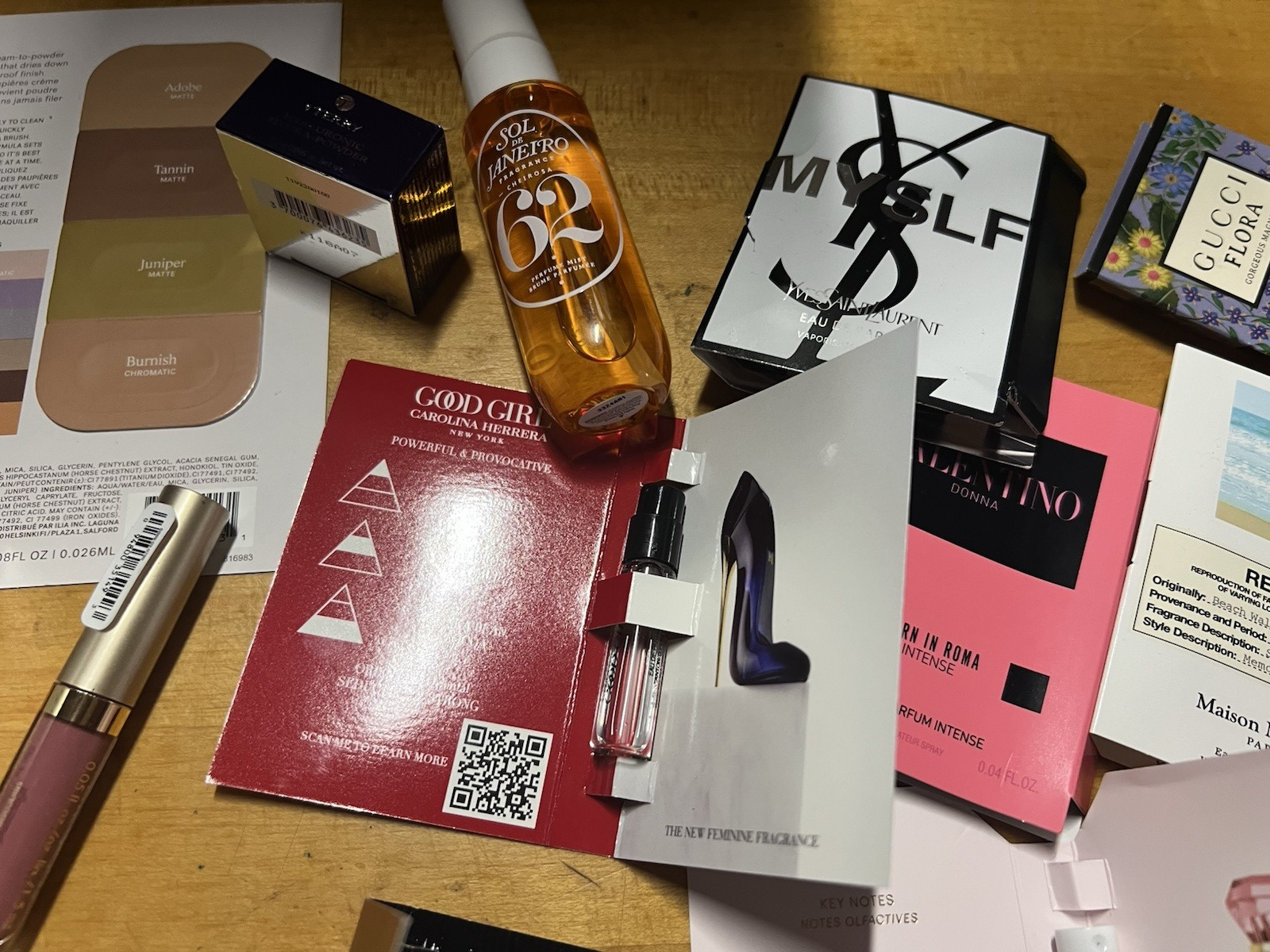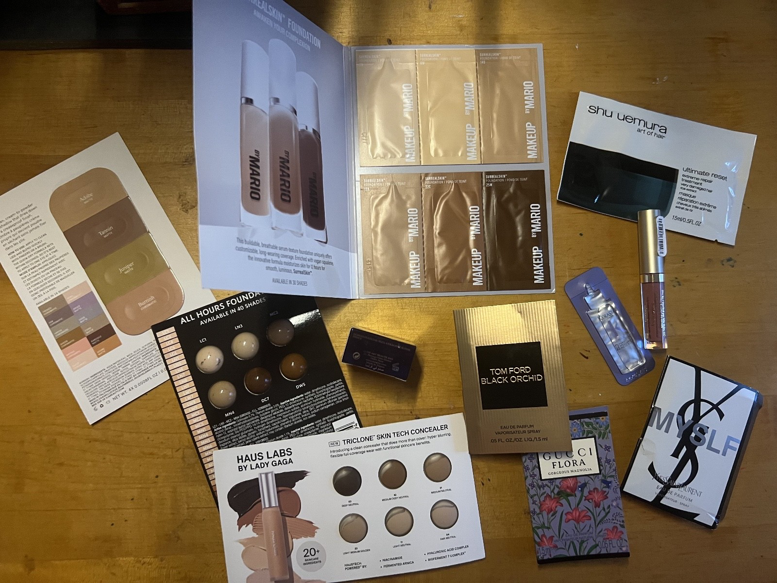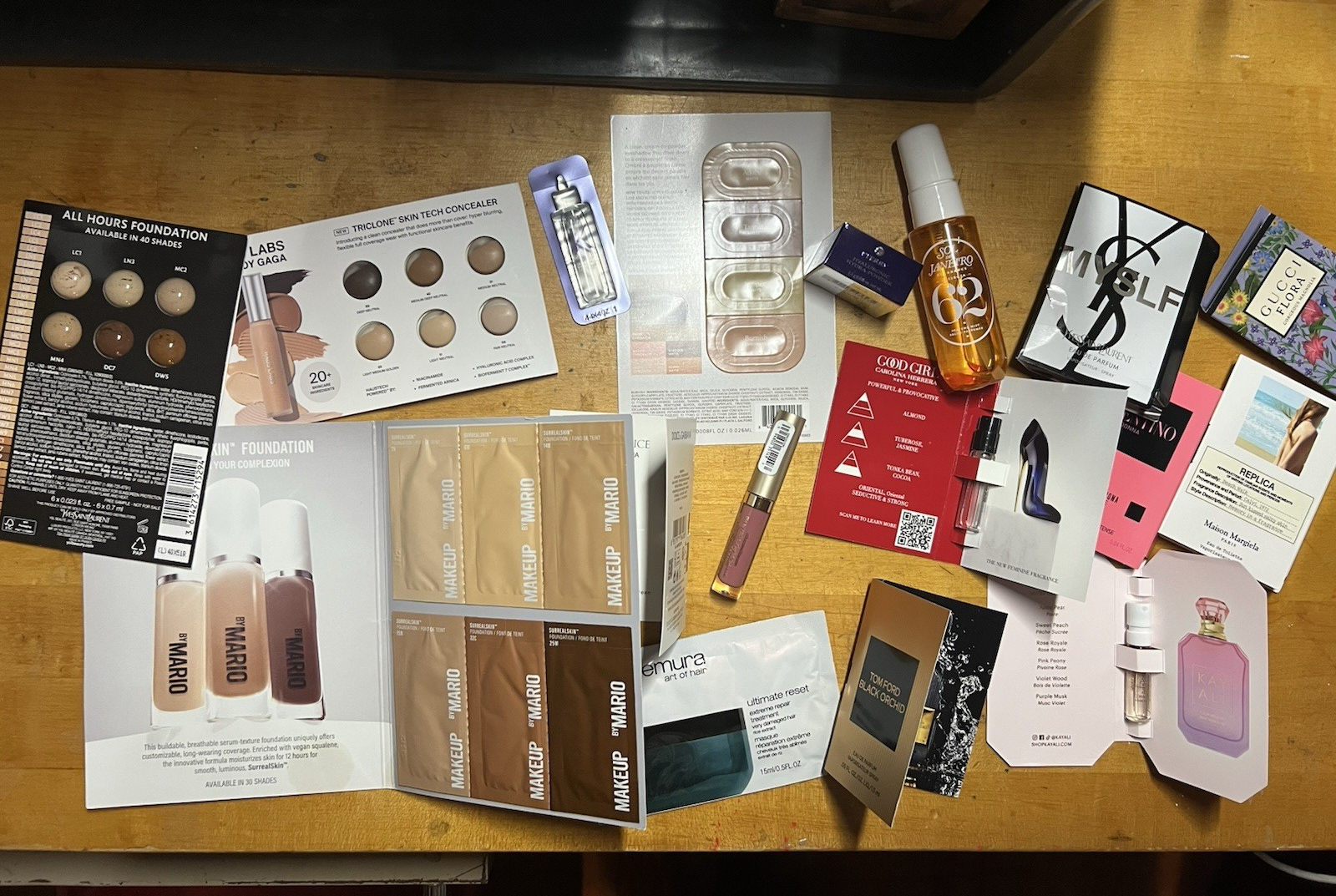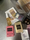 New Lot Luxury Makeup DeluxeTravel Size Samples Perfumes, Hair, Makeup, Bags Great way to sample or travel with these luxury goods! Also great for purse / night out. Plus two satin Neutrogena drawstring bags. ~34 pieces (have tried to list them all!) BYTERRY Hyaluronic Hydra-Powder Deluxe Travel 1.3G/.045 OZ. Blur fine lines, eliminate blemishes, smoothen skin, day or night. TOM FORD Black Orchid Eau de Parfum Sample spray with card stock GUCCI Flora Perfume sample with card stock Eau de parfum .05 fl oz 2 CHANEL Chance Eau Tendre Eau De Parfum spray samples .05 fl oz STILA Stay All Day Liquid Lipstick Patina YSL Myself Eau de Parfum Vial 1.2mL LANCOME Tient Idole Ultraware Glow Reno - 4 color set KERASTASE Blond Absolu 2% Pure Hyaluronic Acid Serum Sample 3.5ml TARTE Maracujá Juicy Lip Plumping Lip Oil deluxe sample .5ML MAKEUP BY MARIO Surrealskin Foundation 6 Shade Portfolio HAUS LABS BY LADY GAGA Triclone Skin Tech Concealer-6 Shades YSL Yves Saint Laurent All Hours Foundation Luminous Matte 6 Shade Card ILIA Liquid Powder Eye Tint - 4 shade card SHU UEMURA Art of Hair Ultimate Reset-Extreme Repair Treatment for very damaged Hair 15ml Deluxe Packet 2 NEUTROGENA blue satin bags with drawstrings. Large 14 x 12. NWT SOL DE JANIERO Cheirosa 62 Bum Bum Hair & Body Perfume Mist Deluxe Size 1oz CAROLINE HERRERA Good Girl EDP .05 fluid oz CAROLINA HERRERA Bad Boy Cobolt elixir EDP spray .05 fl JULIETTE HAS A GUN Lust for Sun EDP .057 fl oz VALENTINO Donna Born in Roma Intense EDP intense .04 fluid oz DOLCE & GABBANA L’impatrice EDT .05 fluid oz MAISON MARGIELA Replica Beach Walk EDT .05 fluid oz MAISON MARGIELA Replica Jazz Club Eau De Toilette spray .05 fl KAY ALI Fleur Majesty Rose Royale EDP .05 fluid oz NARCISCO RODRIGUEZ EDT spray .8ml LOVE BY KILIAN Don't be Shy spray EDP .05 fl oz GIORGIO ARMANI My Way EDP .05 fl oz CLEAN RESERVE Whipped Cherry Farm to Fragrance spray.05 fl oz PEACE OUT ACNE 4 Acne Healing Dots Sample Packet COMMODITY Juice Scent Space: Bold .07 fl oz/2ml THE 7 VIRTUES Vanilla Woods eau de parfum spray sample 1.7 ml Miss Dior EDT spray 1ml Will ship quickly, Please leave feedback, Thank you!